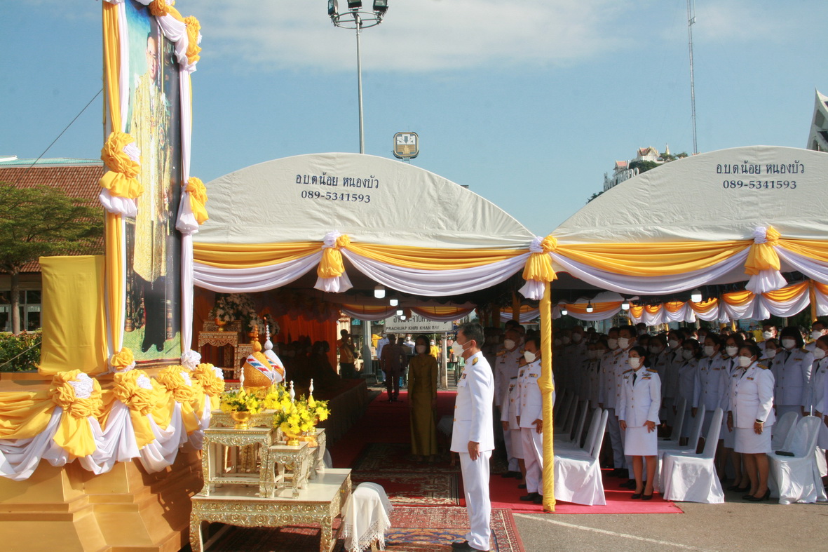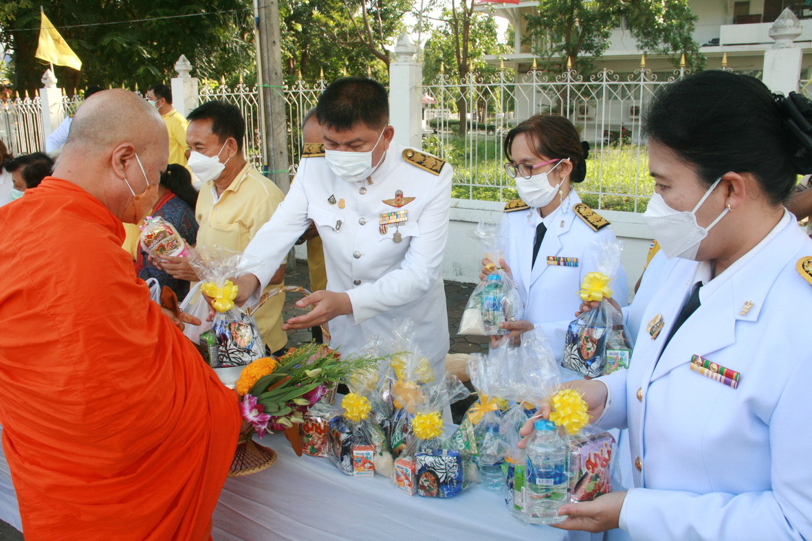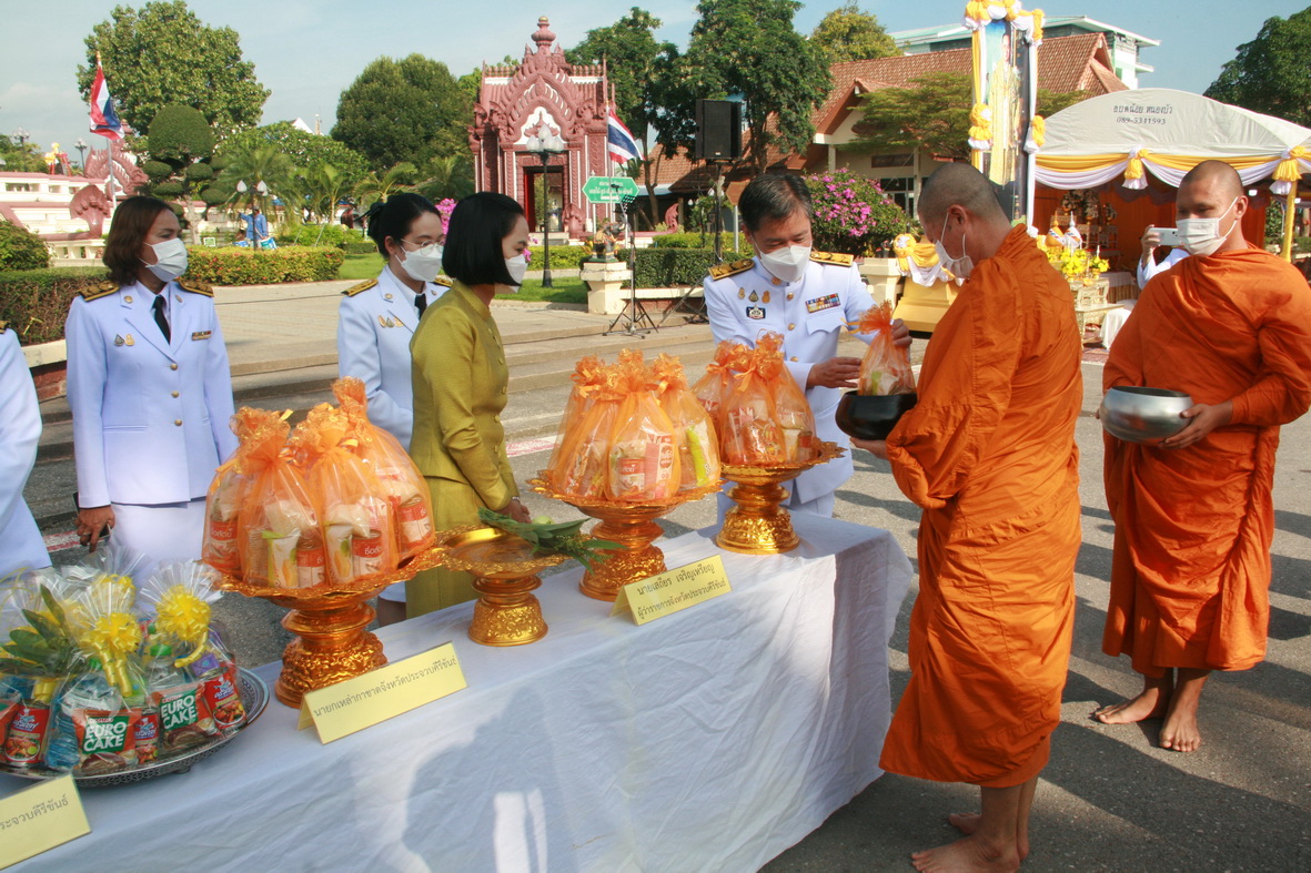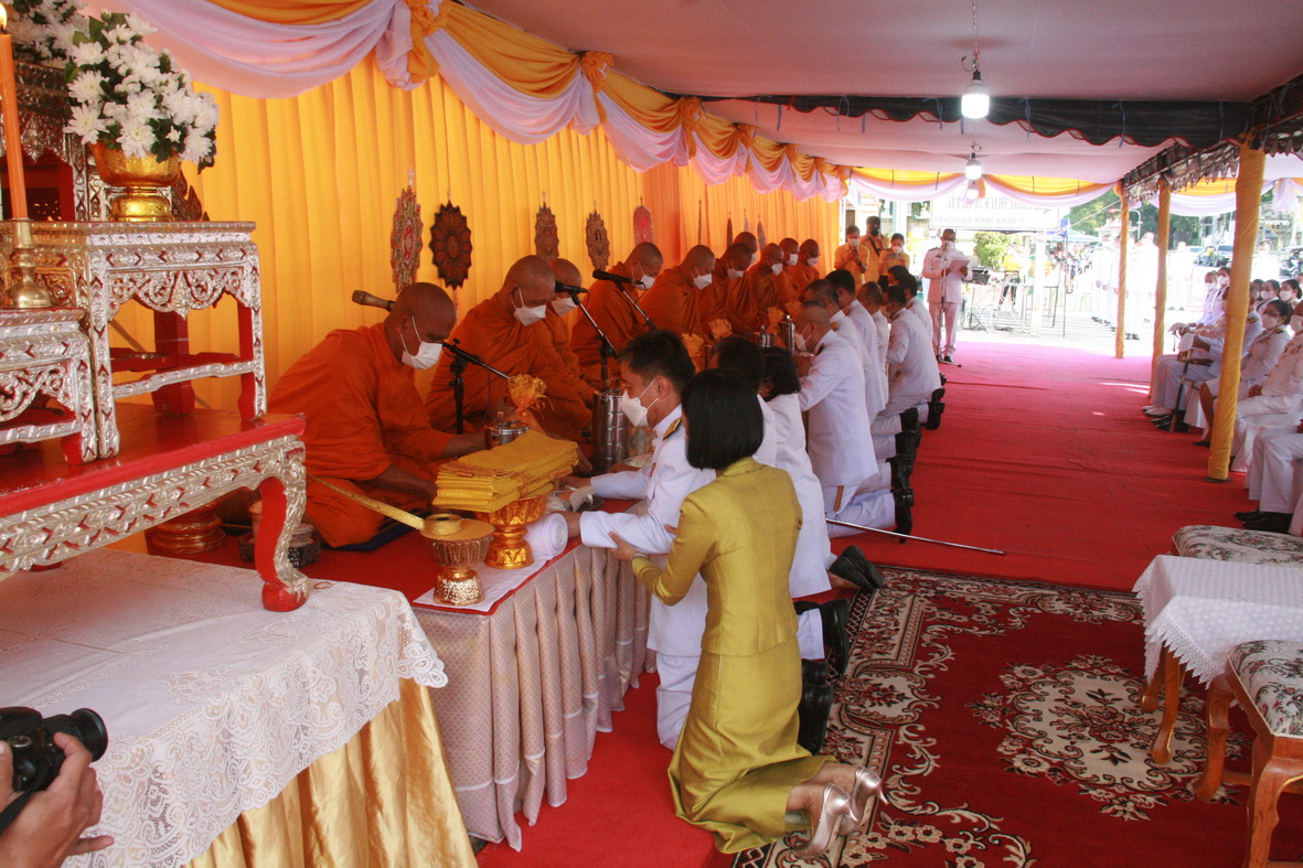 ต่อมา ผู้ว่าราชการจังหวัด นายกเหล่ากาชาดจังหวัด พร้อมด้วย ผู้พิพากษาหัวหน้าศาล รองผู้ว่าราชการจังหวัด หัวหน้าส่วนราชการ ถวายเครื่องไทยธรรม จากนั้น ผู้ว่าราชการจังหวัด ทอดผ้าไตร จำนวน 10 ไตร พระสงฆ์สดับปกรณ์ (ภูษาโยง) พระสงฆ์อนุโมทนา ผู้ว่าราชการจังหวัด กรวดน้ำ ซึ่งต่อมา ผู้ว่าราชการจังหวัด พร้อม นายกเหล่ากาชาดจังหวัด และพสกนิกรทุกภาคส่วน ร่วมทำบุญตักบาตรข้าวสารอาหารแห้ง แด่พระสงฆ์-สามเณร จำนวน 89 รูป ถวายเป็นพระราชกุศล และร่วมน้อมรำลึกในพระมหากรุณาธิคุณ พระบาทสมเด็จพระบรมชนกาธิเบศร มหาภูมิพลอดุลยเดชมหาราช บรมนาถบพิตร เป็นอันเสร็จพิธีในช่วงเช้า