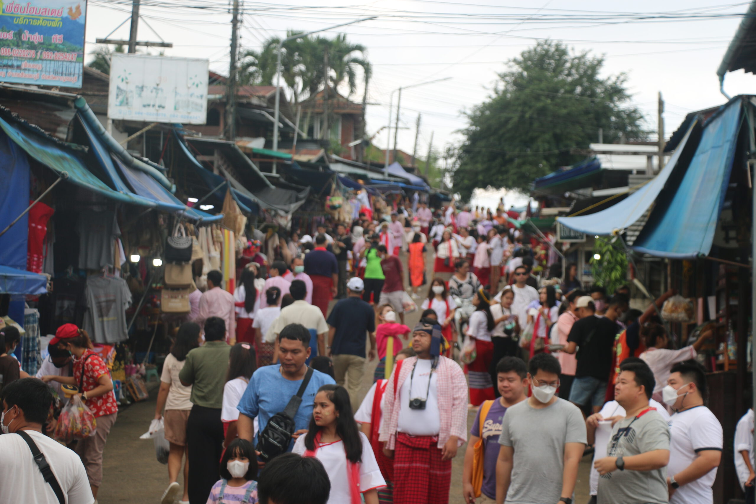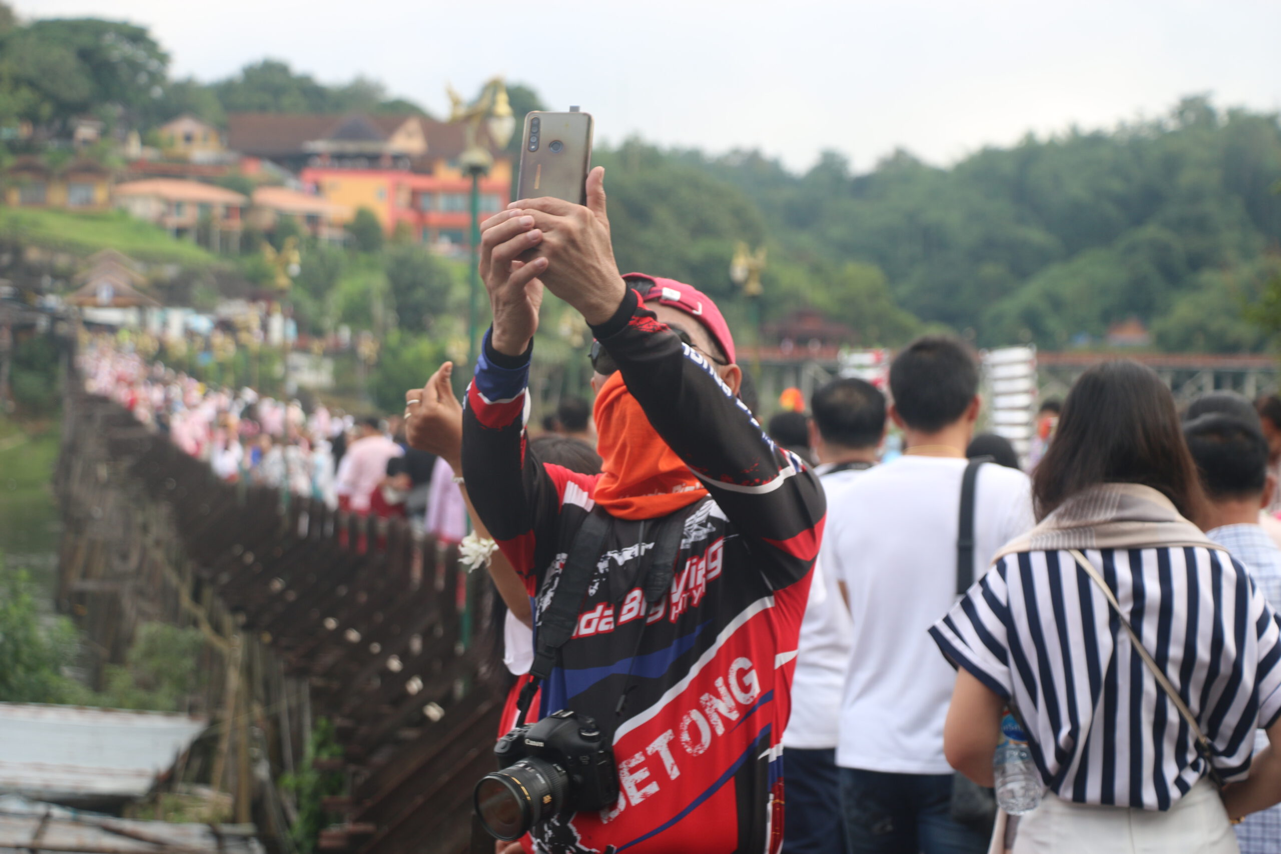 ก่อนจะเดินลงไปเดินเล่นบนสะพานไม้อุตตมานุสรณ์ ซึ่งเป็นสะพานไม้ที่ยาวที่สุดในประเทศไทย ท่ามกลางอากาศยามเช้าที่เย็นสบาย พร้อมทั้งใช้บริการประแป้งทานาคา และเลือกซื้อดอกไม้เพื่อนำไปไหว้พระที่เมืองบาดาล ที่เด็กๆ ชาวมอญ กะเหรี่ยง นำมาบริการนักท่องเที่ยวบนสะพาน ส่งผลให้บนสะพานมอญเต็มไปด้วยนักท่องเที่ยว นอกจากนี้ นักท่องเที่ยวที่เดินทางมาท่องเที่ยวยังถือโอกาสเดินชิมอาหารร้านที่มีชื่อเสียงที่เป็นที่รู้จักกันดีในหมู่นักท่องเที่ยว เช่น ร้านโจ๊กนั่งยอง ร้านขนมป้าหยิน ร้านโจ๊กโบราณ เป็นต้น ส่วนบรรยากาศร้านจำหน่ายสินค้าที่ระลึกจำพวกพวกเสื้อผ้าพื้นเมือง เครื่องประดับต่างๆ มีนักท่องเที่ยวเลือกซื้อสินค้าจำนวนมาก ส่งผลดีต่อชาวบ้านในชุมชนช่วยให้มีรายได้ หลังได้รับผลกระทบจากวิกฤตโควิด-19 ทำให้เศรษฐกิจในพื้นที่ซบเซา