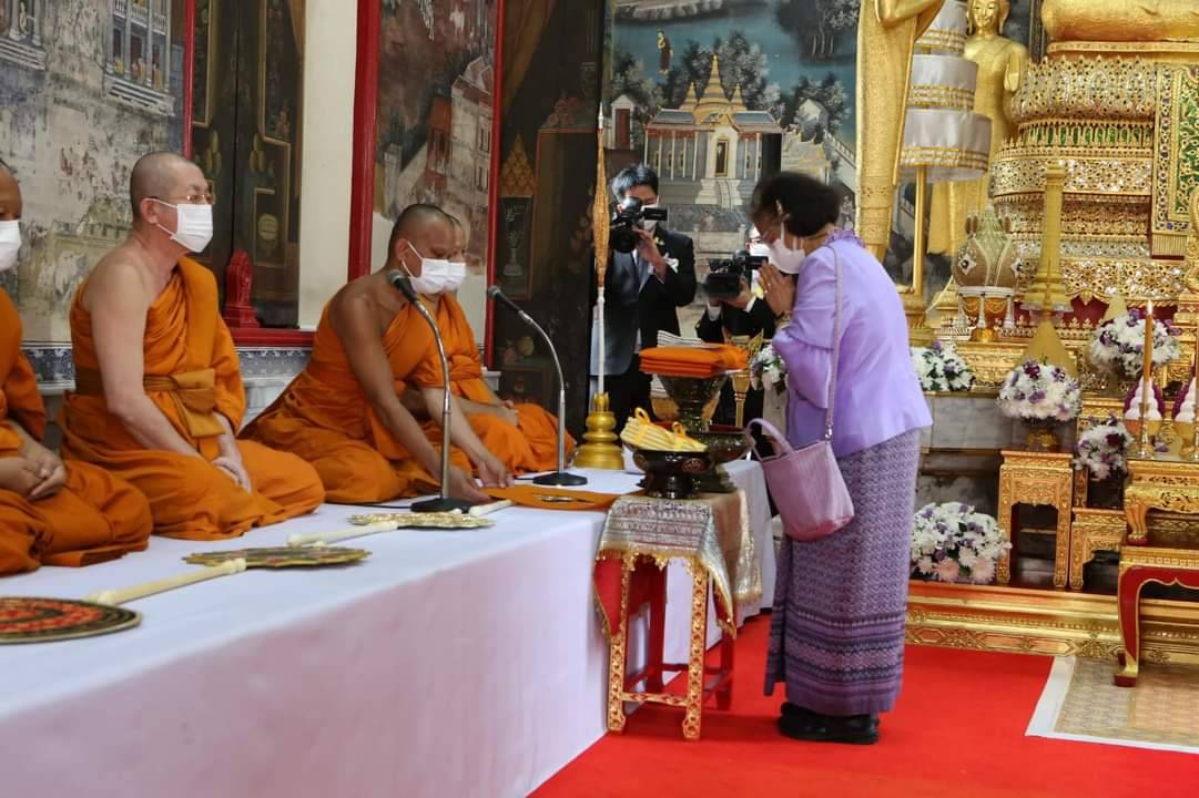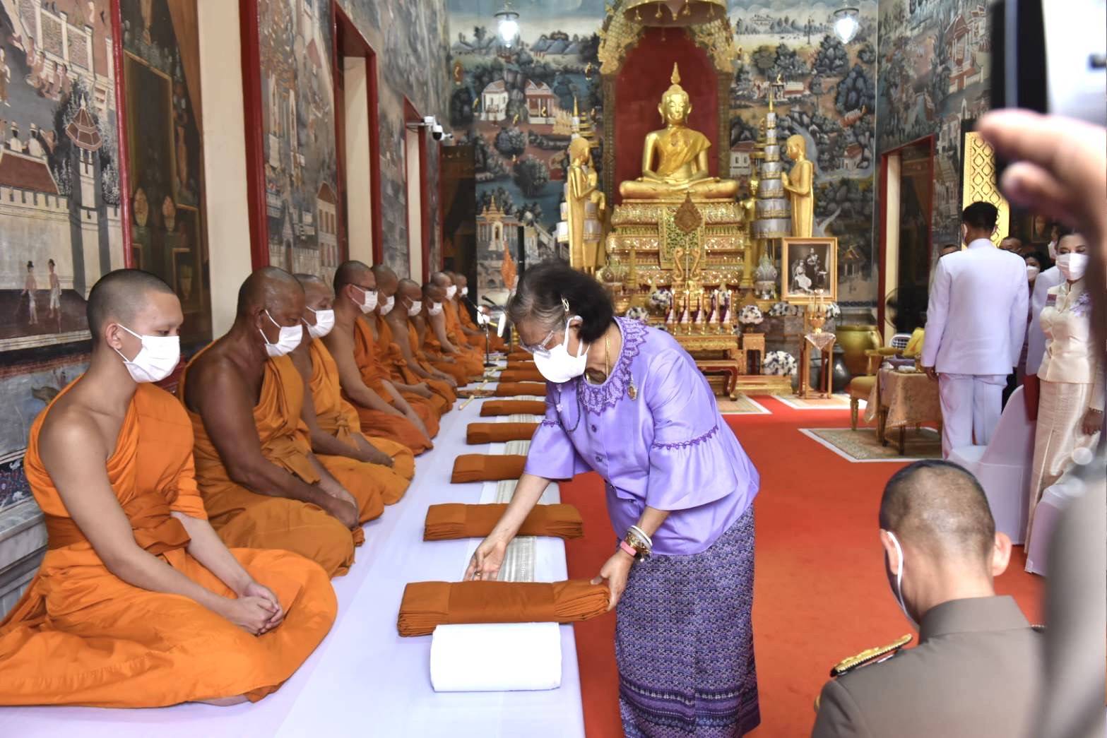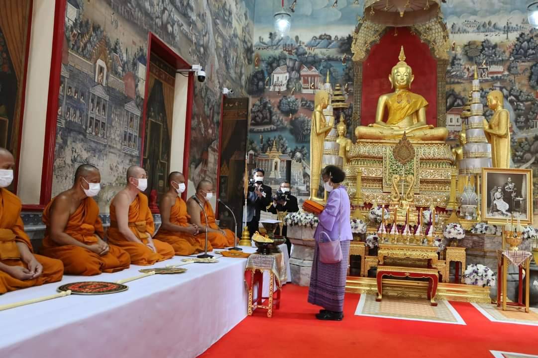 ต่อจากนั้น เสด็จเข้าพระวิหาร ทรงประกอบพิธีบำเพ็ญกุศลถวายผ้าพระกฐิน เมื่อพระสงฆ์ทำพิธีกฐินกรรมแล้ว เสด็จ ฯ ทรงจุดธูปเทียนเครื่องทองน้อยถวายราชสักการะพระบรมฉายาลักษณ์พระบาทสมเด็จพระมงกุฎเกล้าเจ้าอยู่หัว และพระฉายาลักษณ์สมเด็จพระนางเจ้าอินทรศักดิศจี พระวรราชชายา ในรัชกาลที่ 6 ทรงทอดผ้าไตร 10 ไตร บนพระภูษาโยงที่อาสน์สงฆ์ พระสงฆ์ 10 รูป สดับปกรณ์ ทรงประเคนเครื่องบริวารพระกฐินแด่พระสงฆ์ผู้ครองผ้าพระกฐิน และทรงหลั่งทักษิโณทก
