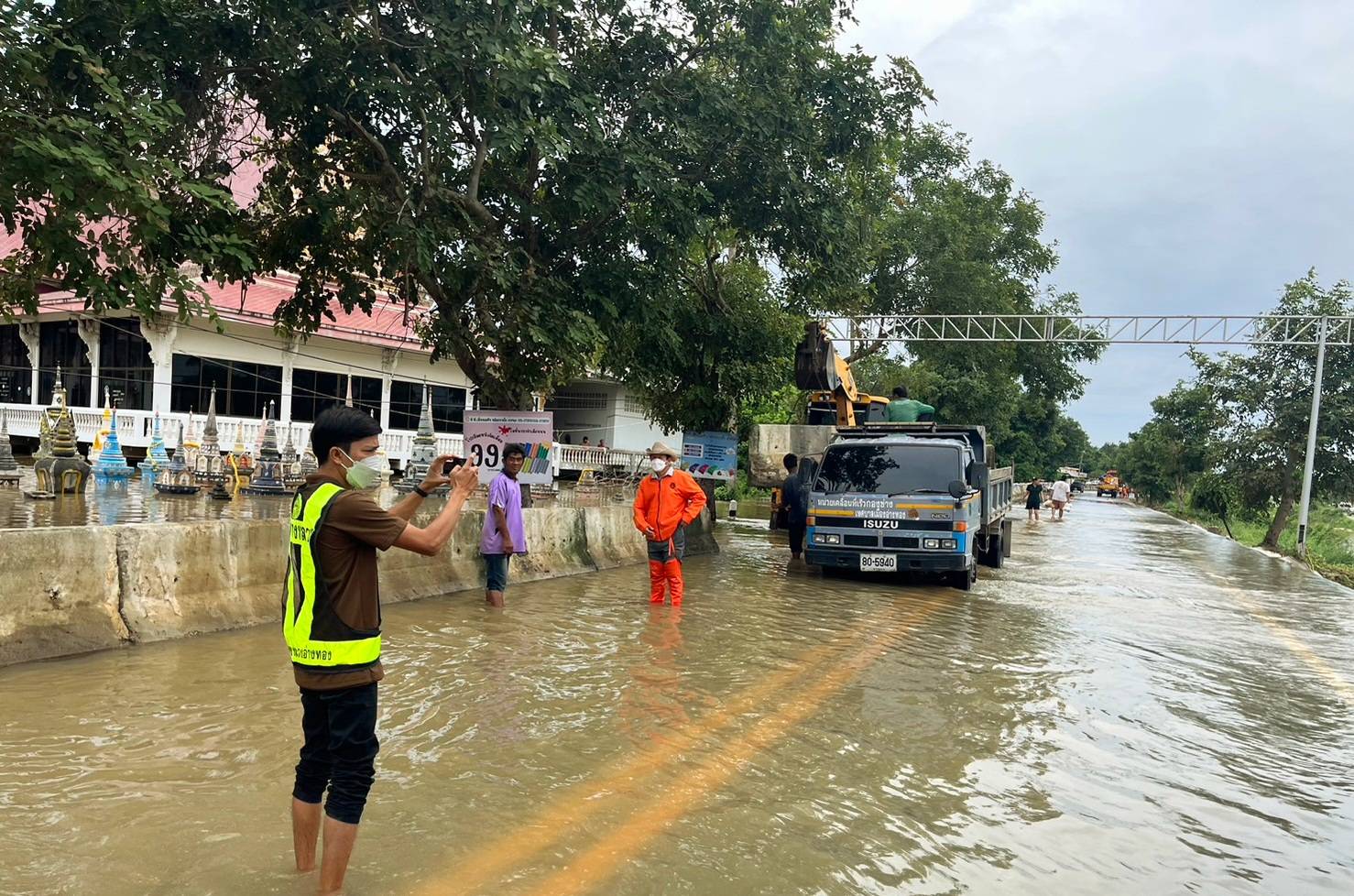 2.วางแบริเออร์เรียงกระสอบทรายบริเวณหน้าวัดไชยสงคราม ป้องกันน้ำเข้าท่วมพื้นที่ชุมชนเมืองใหม่ชัยมงคล