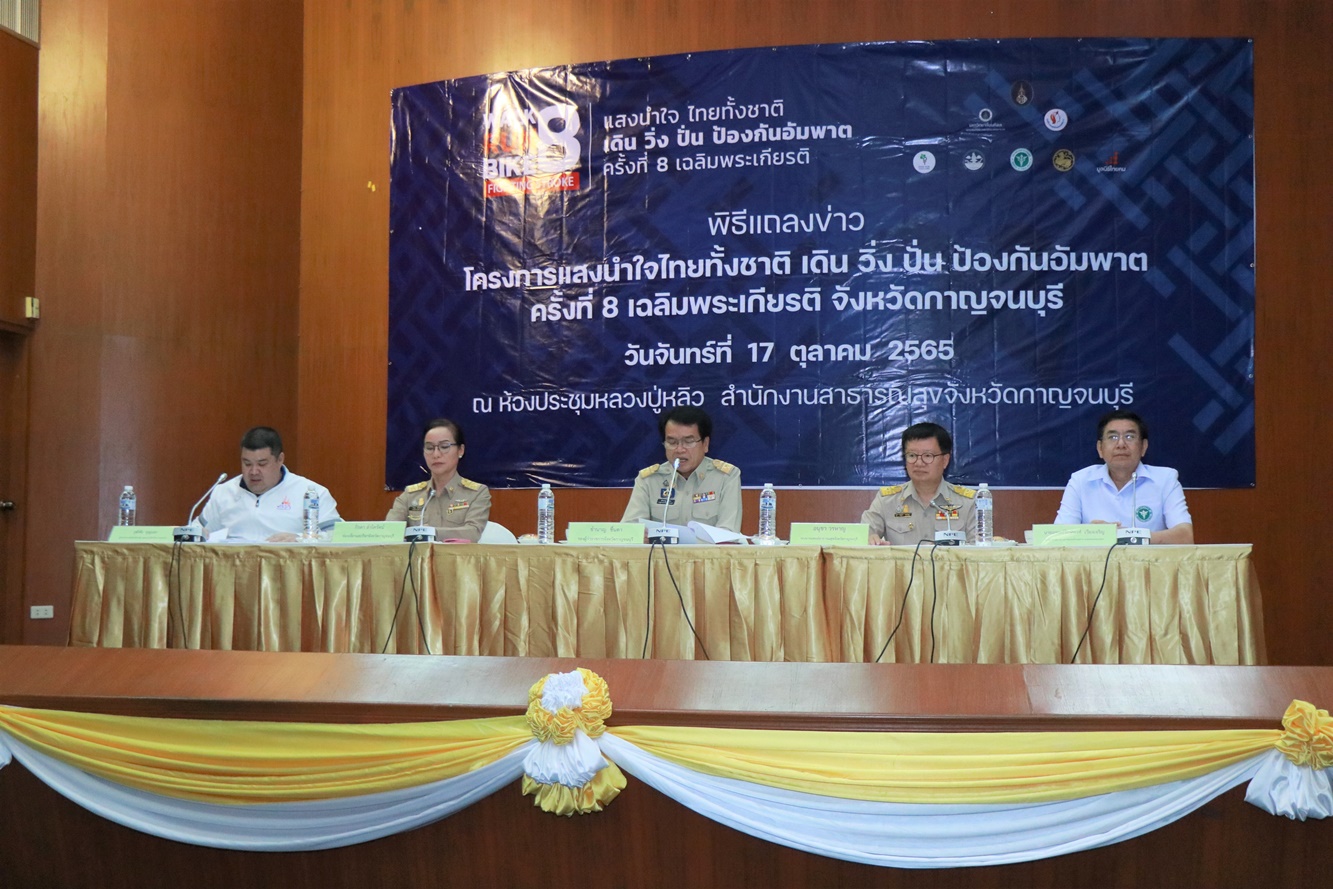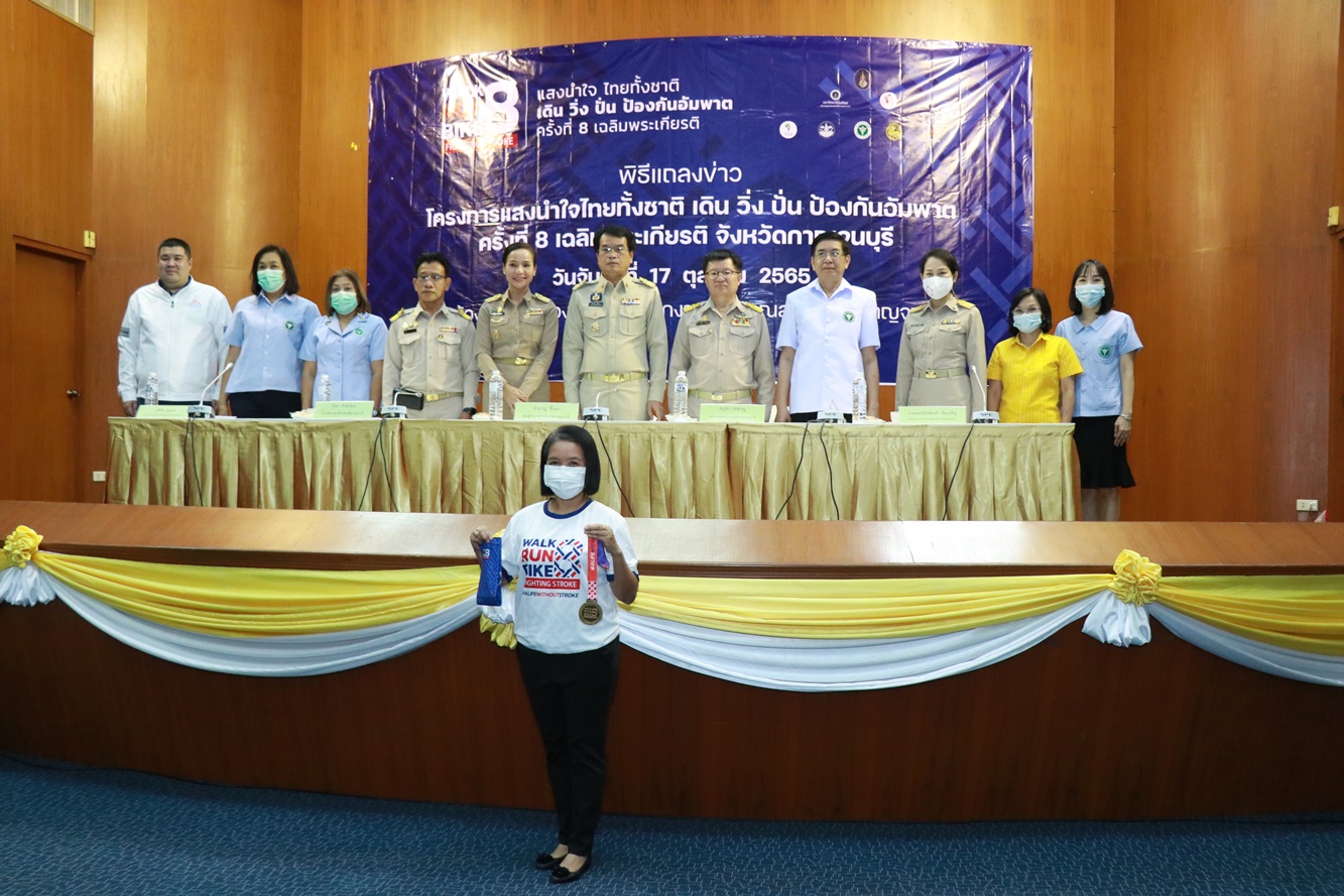 กาญจนบุรี แถลงข่าวการจัดกิจกรรมโครงการแสงนำใจ ไทยทั้งชาติ เดิน วิ่ง ปั่น ป้องกันอัมพาต ครั้งที่ 8 เฉลิมพระเกียรติ “แผ่นดินไทยไร้สโตรค” ที่จะจัดขึ้นในวันอาทิตย์ ที่ 30 ตุลาคม พ.ศ.2565 ตั้งแต่เวลา 05.00 น.ที่ ศาลากลางจังหวัดกาญจนบุรีพร้อมกันกับทั่วประเทศ เพื่อรณรงค์ให้ประชาชนออกกำลังกายป้องกันโรคหลอดเลือดสมองและโรคอื่นๆ