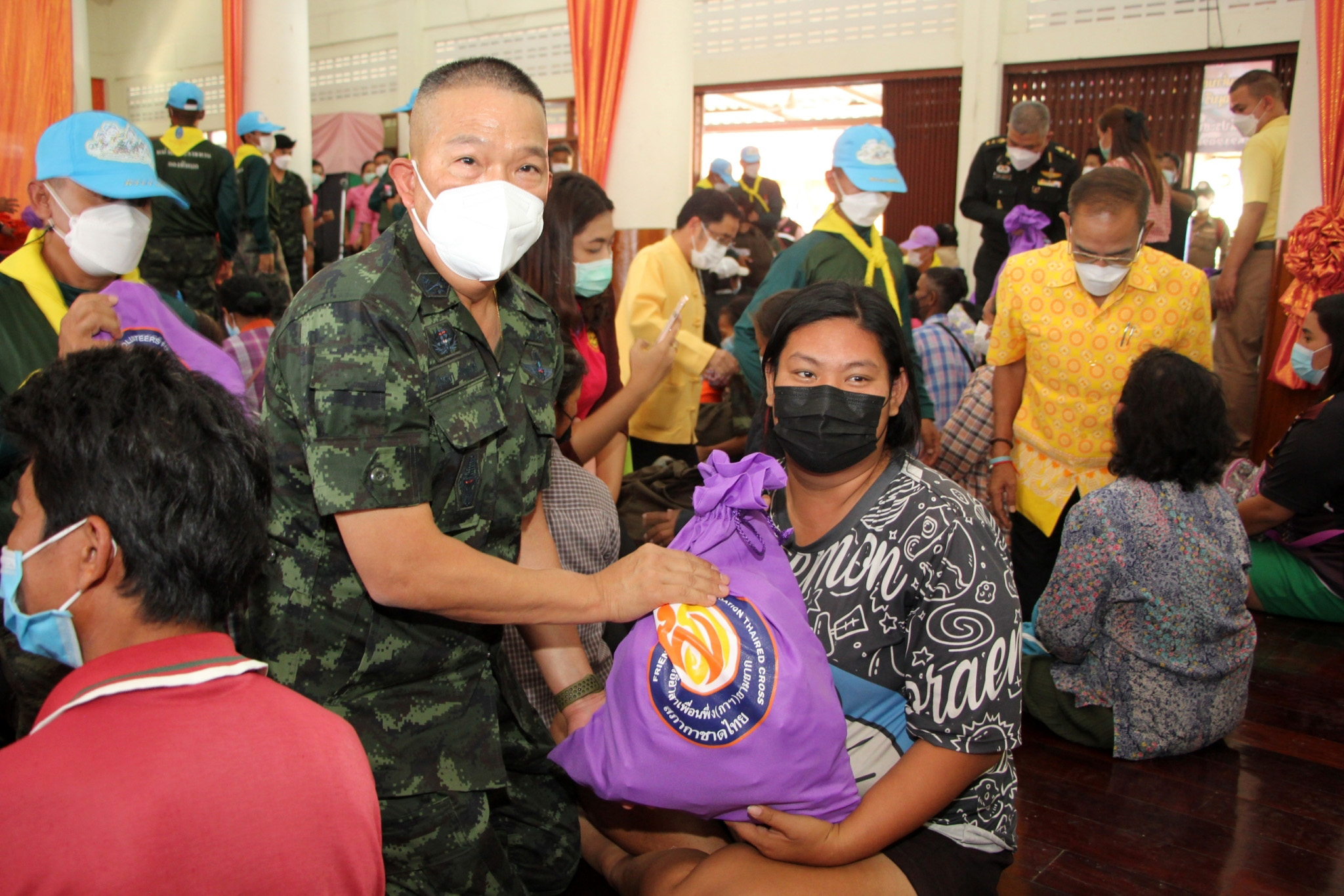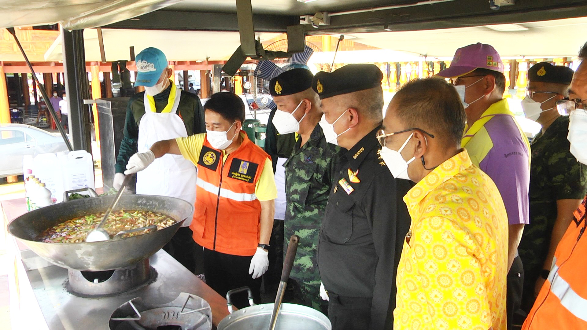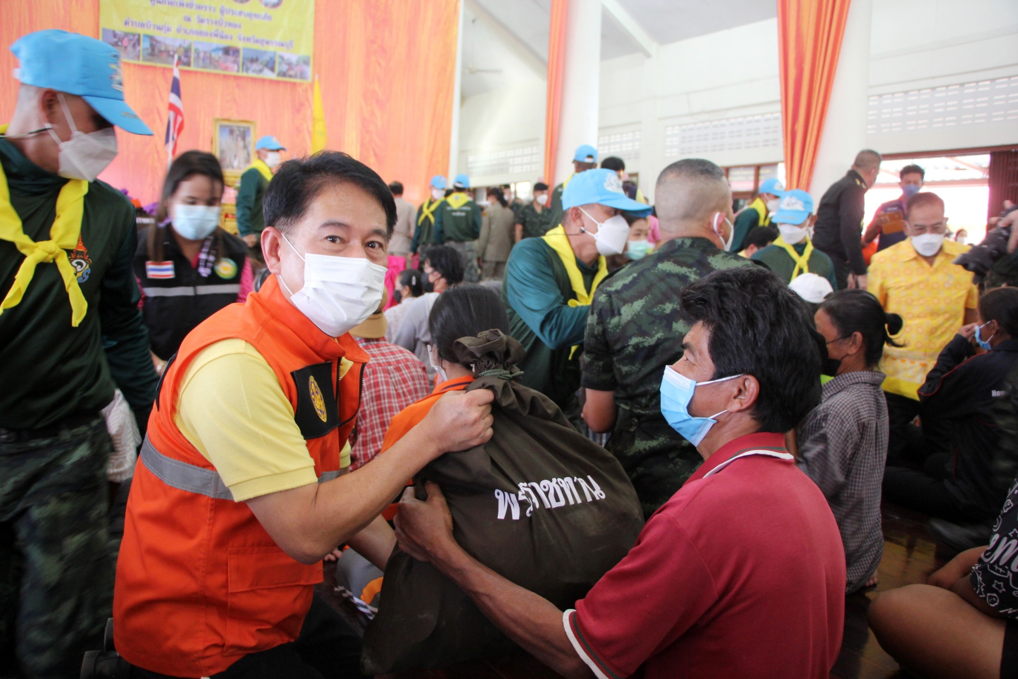 หลังพิธีเปิดศูนย์ผู้ว่าราชการจังหวัดสุพรรณบุรี พร้อมคณะรองผู้ว่าและนายทหารร่วมกันประกอบอาหารบนรถประกอบอาหาร แจกจ่ายให้กับประชาชน และมอบสิ่งของพระราชทานมูลนิธิราชประชานุเคราะห์ฯ และมูลนิธิอาสาเพื่อนพึ่ง (ภาฯ) ยามยาก สภากาชาดไทย ให้แก่ประชาชนที่เข้ามาพักอาศัยที่ศูนย์พักพิงฯ จำนวน 191 ครัวเรือน