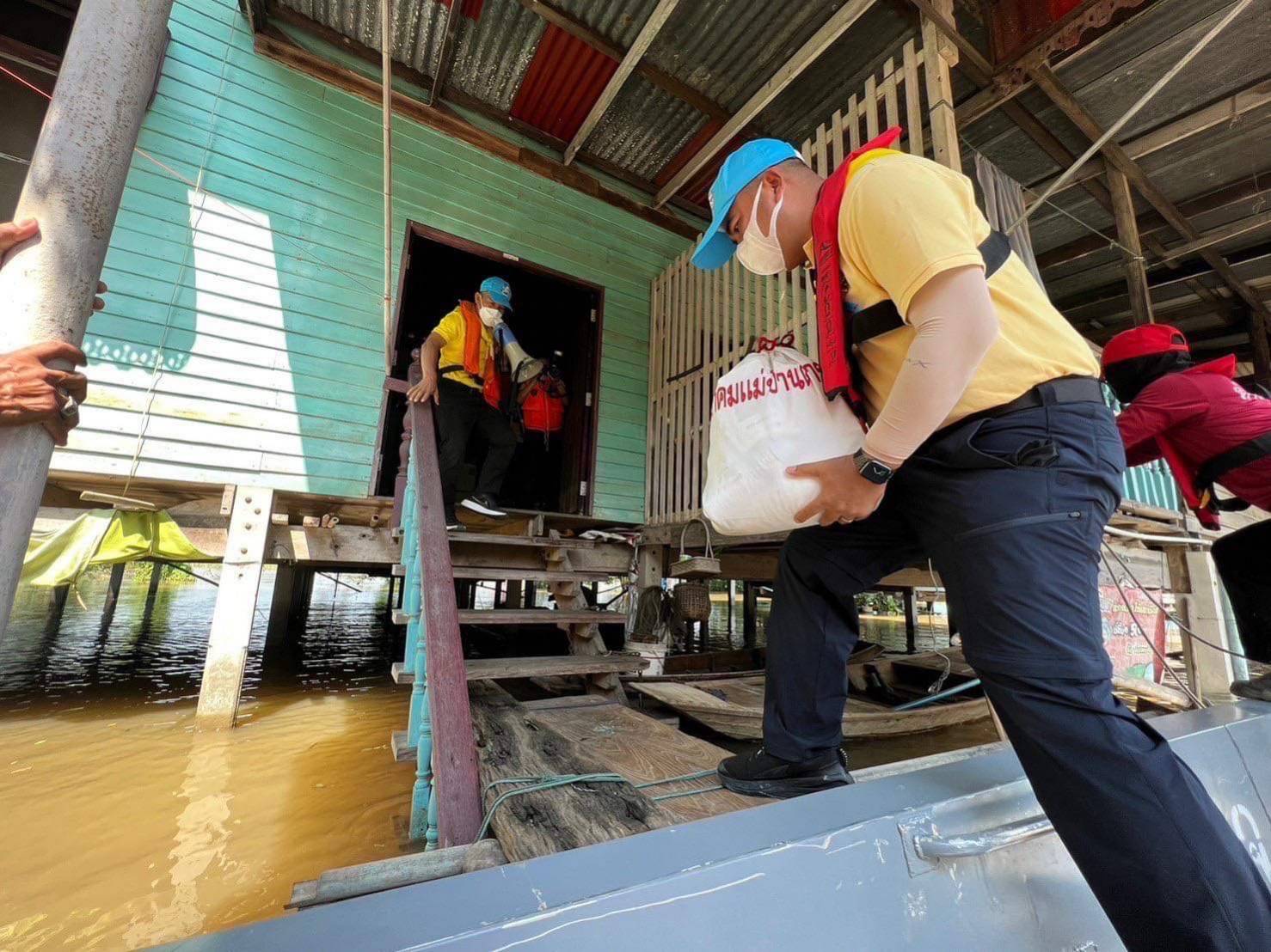 จากนั้น พล.ต.ต.พันธนะ นุชนารถ พร้อมคณะ ได้นั่งเรือ ไปที่วัดอินทาราม ซึ่งเป็นจุดน้ำท่วมสูงสุดเพื่อถวายถุงยังชีพและสังฆทาน แด่พระภิกษุสงฆ์ ก่อนส่งมอบถุงยังชีพให้ประชาชนทางน้ำ เพื่อช่วยเหลือผู้ป่วยติดเตียงที่อาศัยอยู่ในบ้านเรือนที่ประสบอุทกภัย