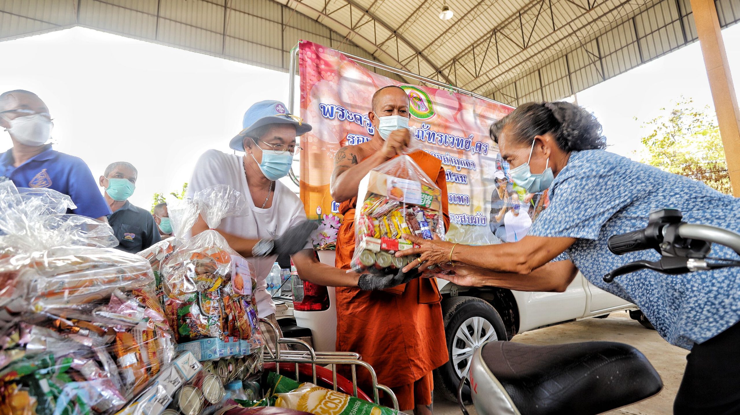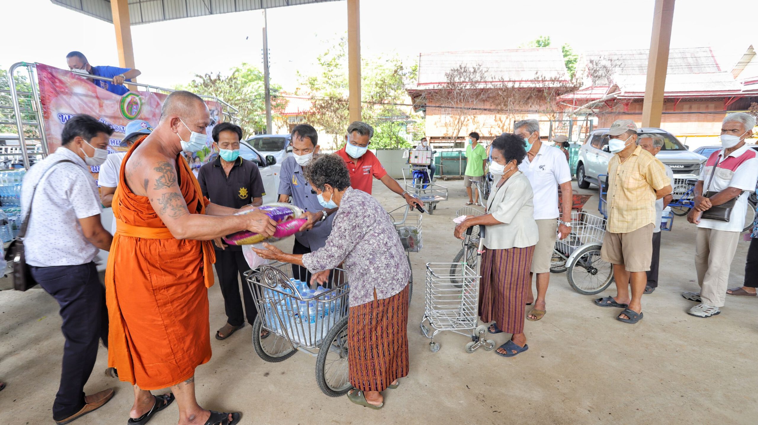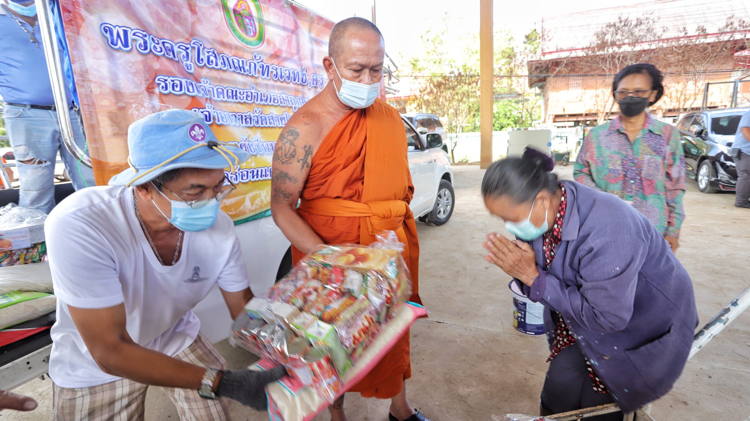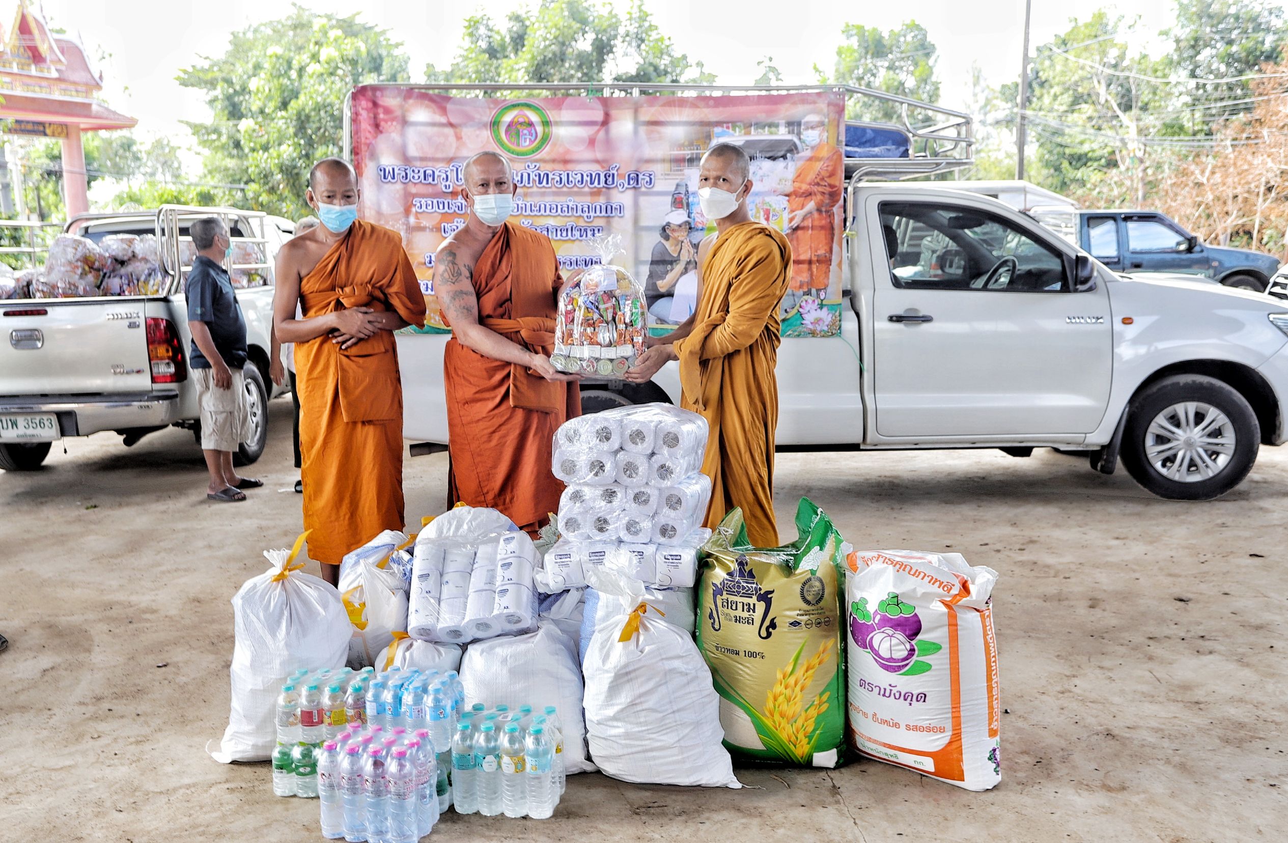 จากนั้นได้นำสิ่งของ ข้าวสาร อาหารแห้ง น้ำดื่ม ไปมอบให้วัดพลับสุทธาวาส ต.เชียงรากน้อย อ.สามโคก จ.ปทุมธานี เพื่อนำไปส่งต่อชาวบ้านที่ได้รับผลกระทบจากน้ำท่วมต่อไป