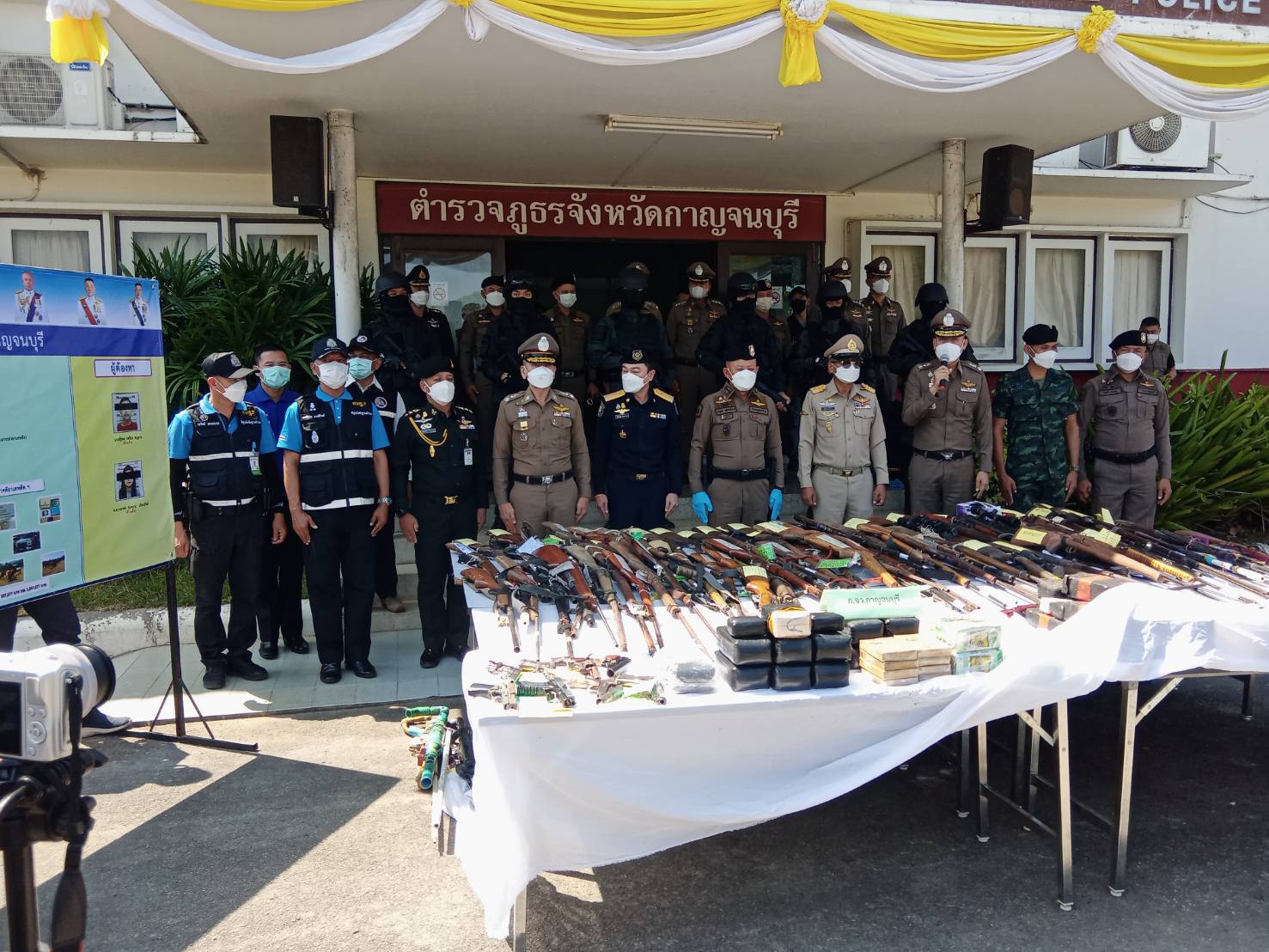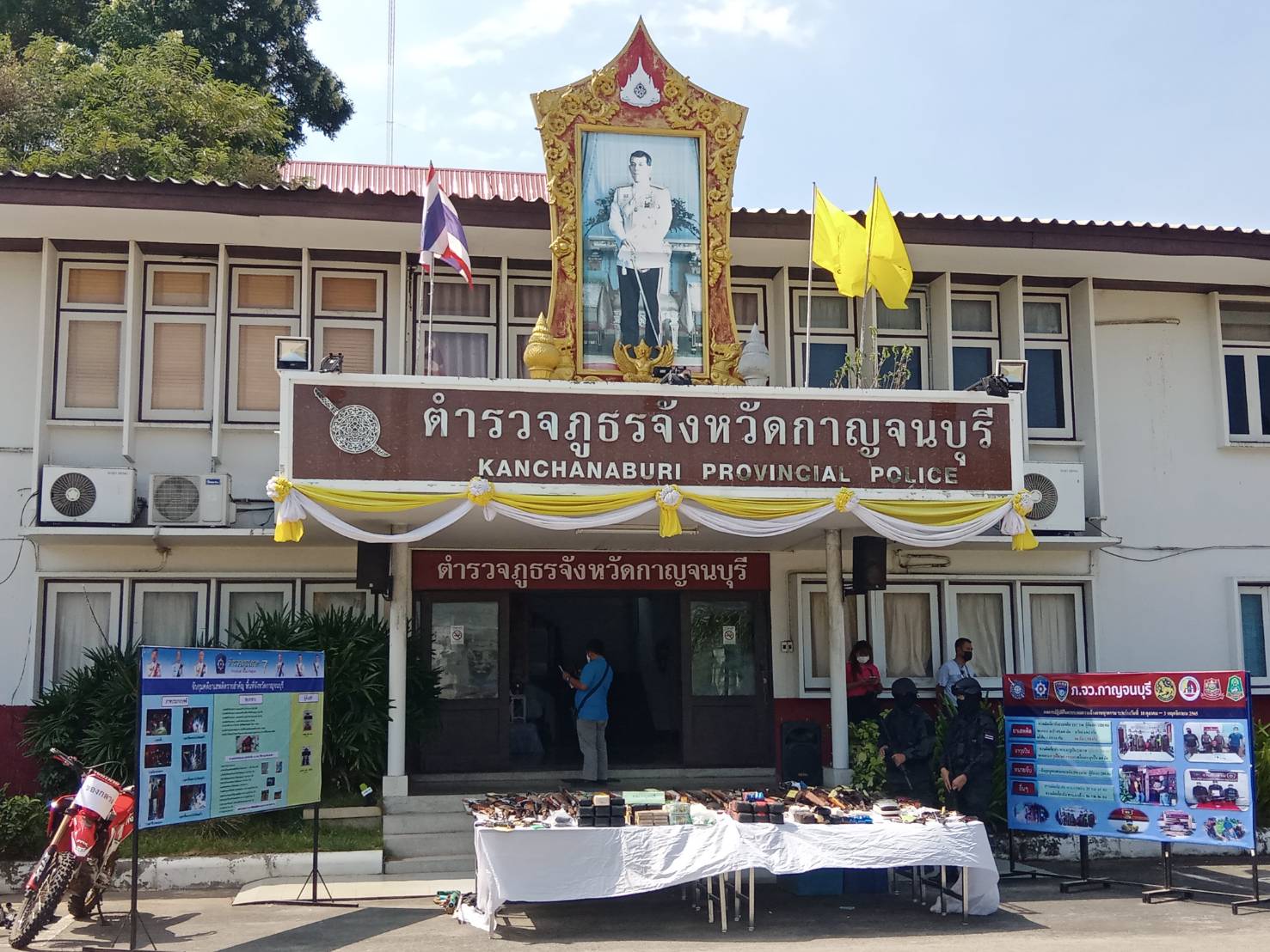 วันที่ 4พฤศจิกายน 2565 ที่กองบังคับการตำรวจภูธรจังหวัดกาญจนบุรี พลตำรวจโท ธนายุฒม์ วัฒิจรัสธำรงค์ ผู้บัญชาการตำรวจภูธรภาค 7 ร้อยตรีพงศธร ศิริสาคร รอง ผู้ว่าราชการจังหวัดกาญจนบุรี พลตำรวจตรี ไพโรจน์ คุ้มภัย ผู้บังคับตำรวจภูธรจังหวัดกาญจนบุรี นายทัศน์พงษ์ วัฒนายากร ผู้อำนวยการ ปปส.ภาค 7 พร้อมเจ้าหน้าที่หน่วยเฉพาะกิจ ลาดหญ้า กองกำลังสุรสีห์กาญจนบุรี เจ้าหน้าที่ กอ.รมน.กาญจนบุรี เจ้าหน้าที่ทหาร มณฑลทหารบกที่ .17 ร่วมแถลงข่าว ระดมกวาดล้างอาชญากรรม ยาเสพติด อาวุธปืน คดีค้างเก่า ในพื้นที่จังหวัดกาญจนบุรี ก่อนที่จะมีการประชุมเอเปคที่จะมีขึ้นกลางเดือน พฤศจิกายน นี้