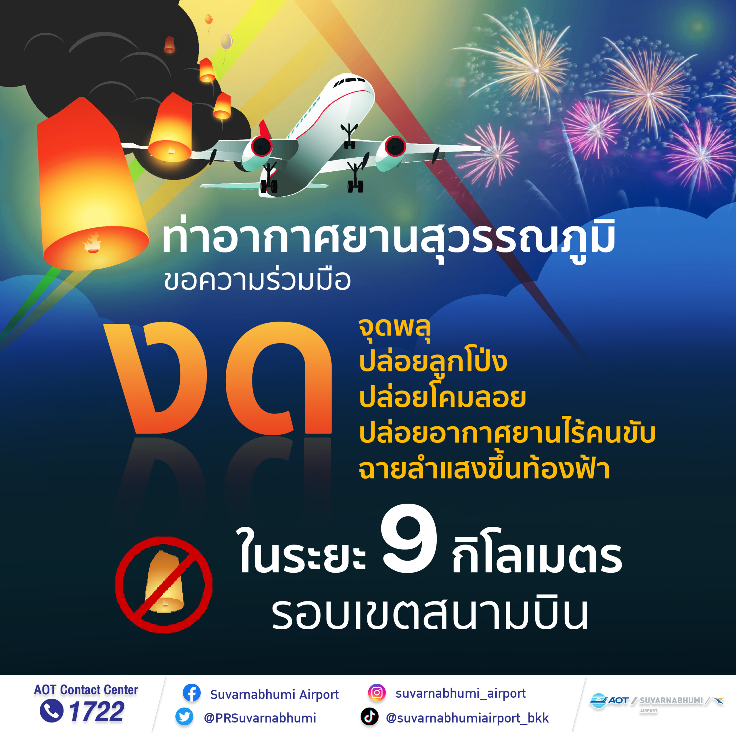 ท่าอากาศยานสุวรรณภูมิขอความร่วมมือหน่วยงานและประชาชนโดยรอบงดปล่อยโคมลอย ลูกโป่ง จุดพลุไฟในช่วงเทศกาลลอยกระทง ป้องกันอันตรายและอุบัติเหตุต่ออากาศยาน