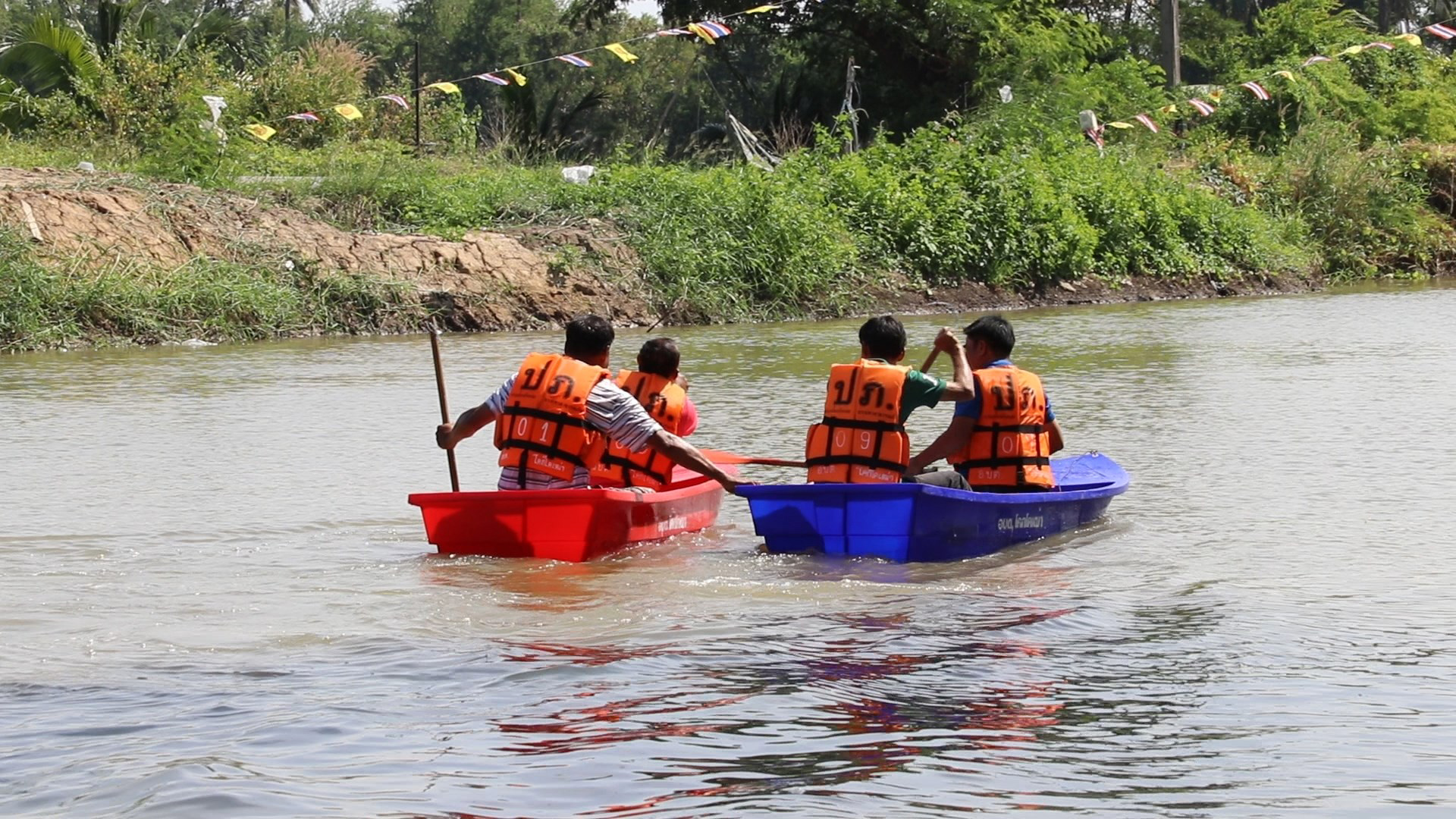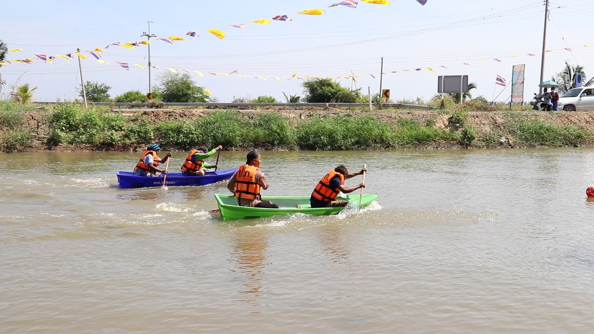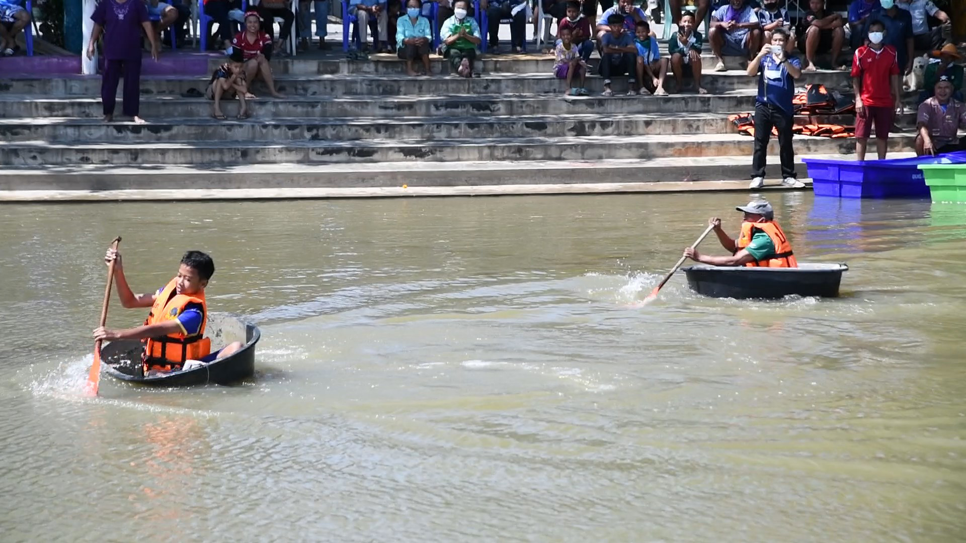 การแข่งขันกีฬาพายเรือพื้นบ้าน มีทีมผู้เข้าสมัครกว่า10ทีม ชื่อทีมแต่ละทีมฟังแล้วเรียกเสียงหัวเราะกันทั้งงาน เช่น “ทีมเลวสุดๆ” “ทีมแสบแป๊ด” “ทีมสามกั๊ก” เป็นต้น ผู้ที่ลงแข่งขันจะต้องสามัคคีกัน ช่วยกันพายเรือเข้าเส้นชัยให้ไวที่สุด บางทีมแค่เริ่มสตาร์ทออกตัวเรือก็ล่มไม่เป็นท่าแล้ว เรียกเสียงหัวเราะให้กับเด็กนักเรียน ครู และชาวบ้าน อย่างสนุกสนาน แต่ที่เรียกเสียงหัวเราะมากที่สุดก็น่าจะเป็นการแข่งขันพายกระบะผสมปูน ที่ทำให้ผู้เข้าแข่งขันต้องลุ้นว่าใครจะโชคดีได้กระบะปูนไม่รั่ว ไม่เช่นนั้นเวลาพายก็จะไปไม่ถึงเส้นชัย ส่วนคู่ไฮไลน์ก็จะเป็นคู่วีไอพี ระหว่างนายก อบต.โคกโคเฒ่า จับคู่พายเรือแข่งกับรองนายก อบต.เรียกเสียงเชียร์จากขอบสนามอย่างสนุกสนาน งานนี้กินกันไม่ลง ต้องตัดสินกันที่รอบที่สอง ซึ่งผลการแข่งขันฝ่ายนายกฯเข้าเส้นชัยไป
