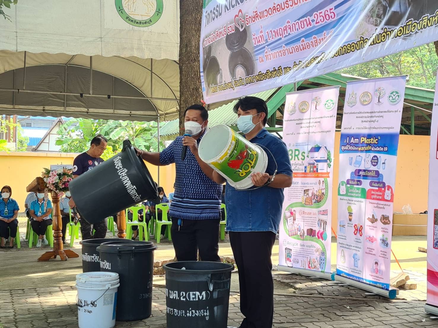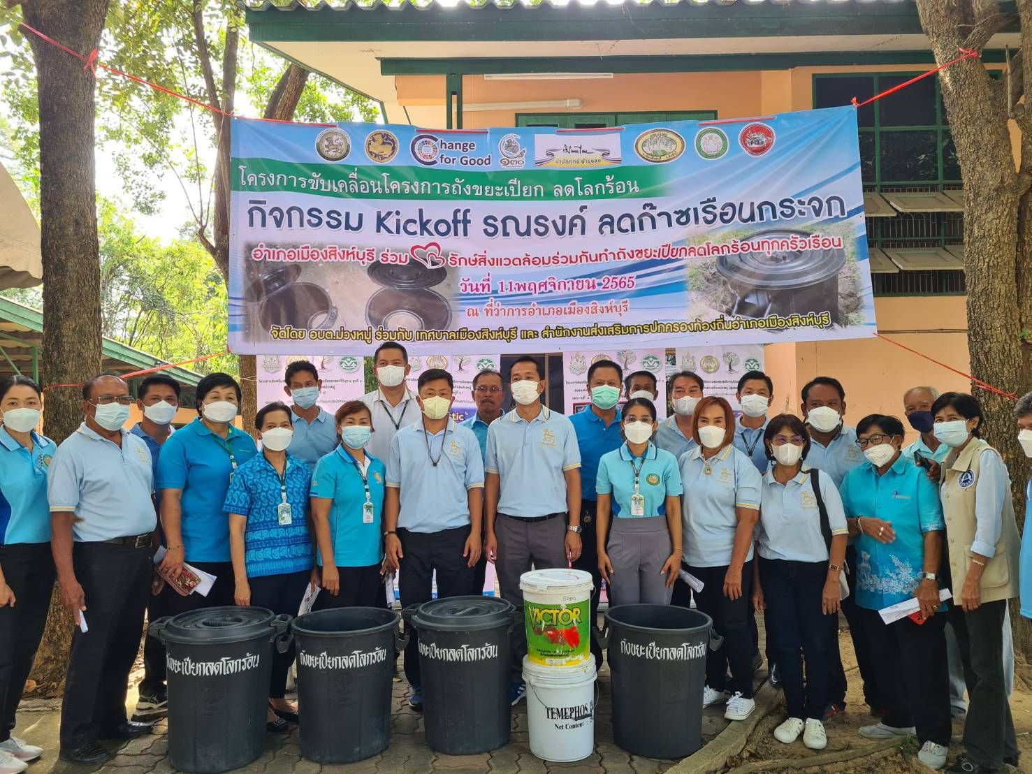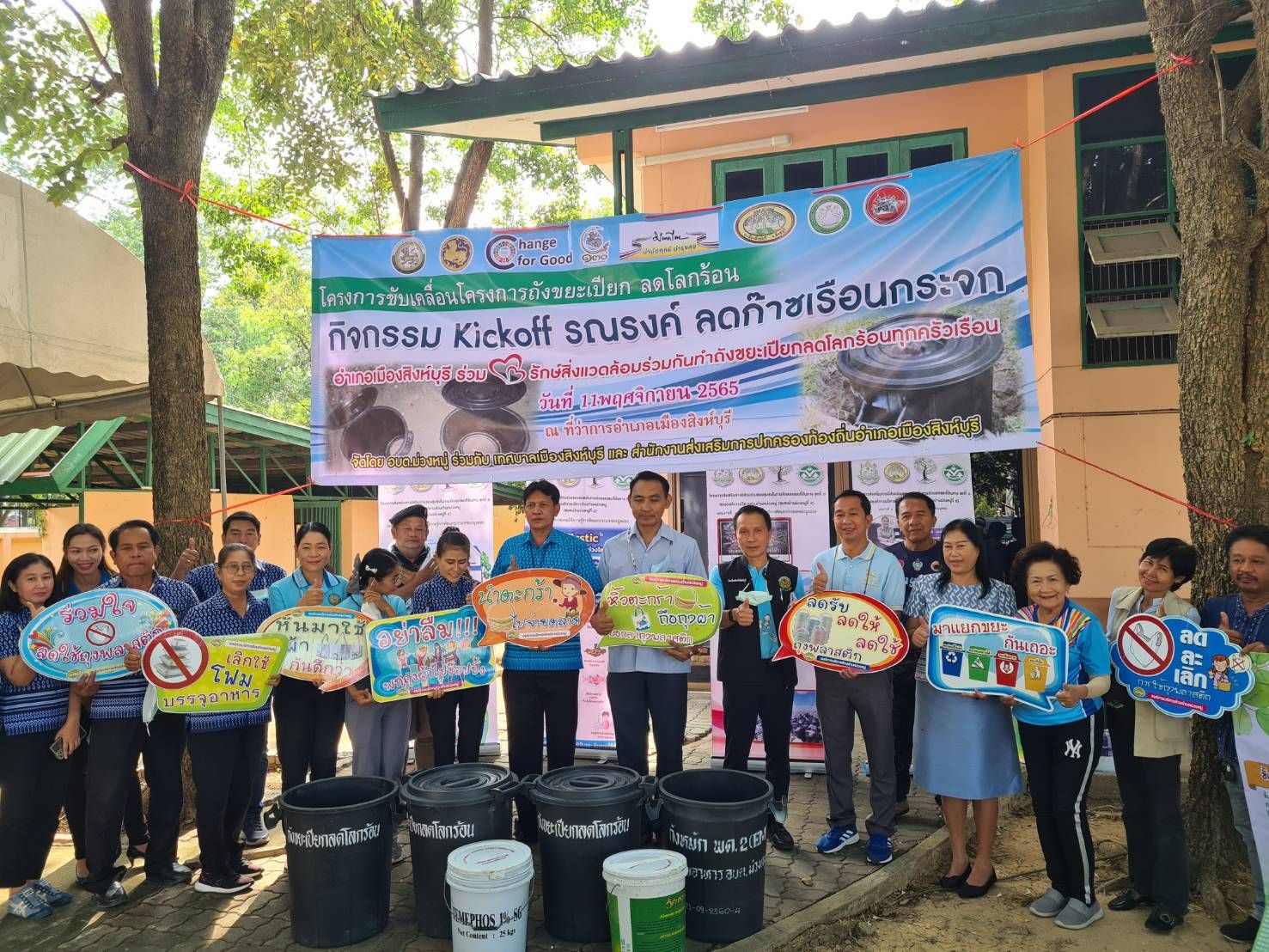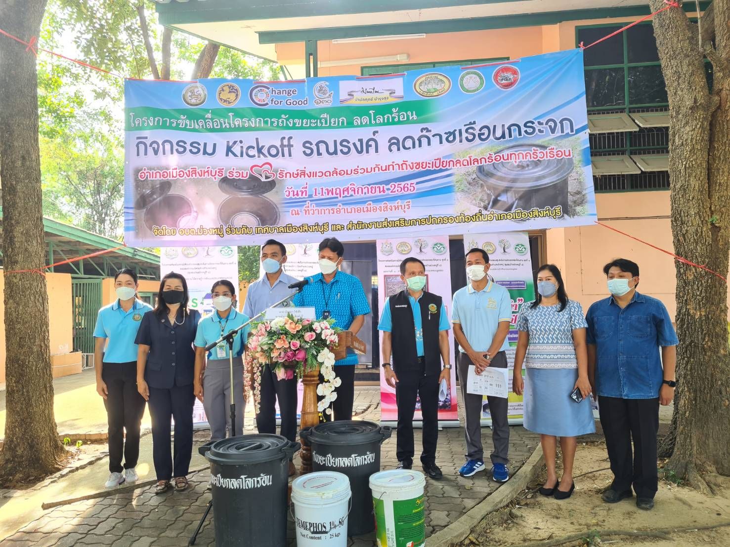 รูปธรรม ท้องถิ่นจังหวัดสิงห์บุรี ร่วมกับองค์การบริหารส่วนตำบลม่วงหมู่ และเทศบาลเมืองสิงห์บุรี จึงได้จัดกิจกรรม รณรงค์ลดก๊าซเรือนกระจก “อำเภอเมืองสิงห์บุรี รักษ์สิ่งแวดล้อม ร่วมกันจัดทำถังขยะเปียก ลดโลกร้อนทุกครัวเรือน”