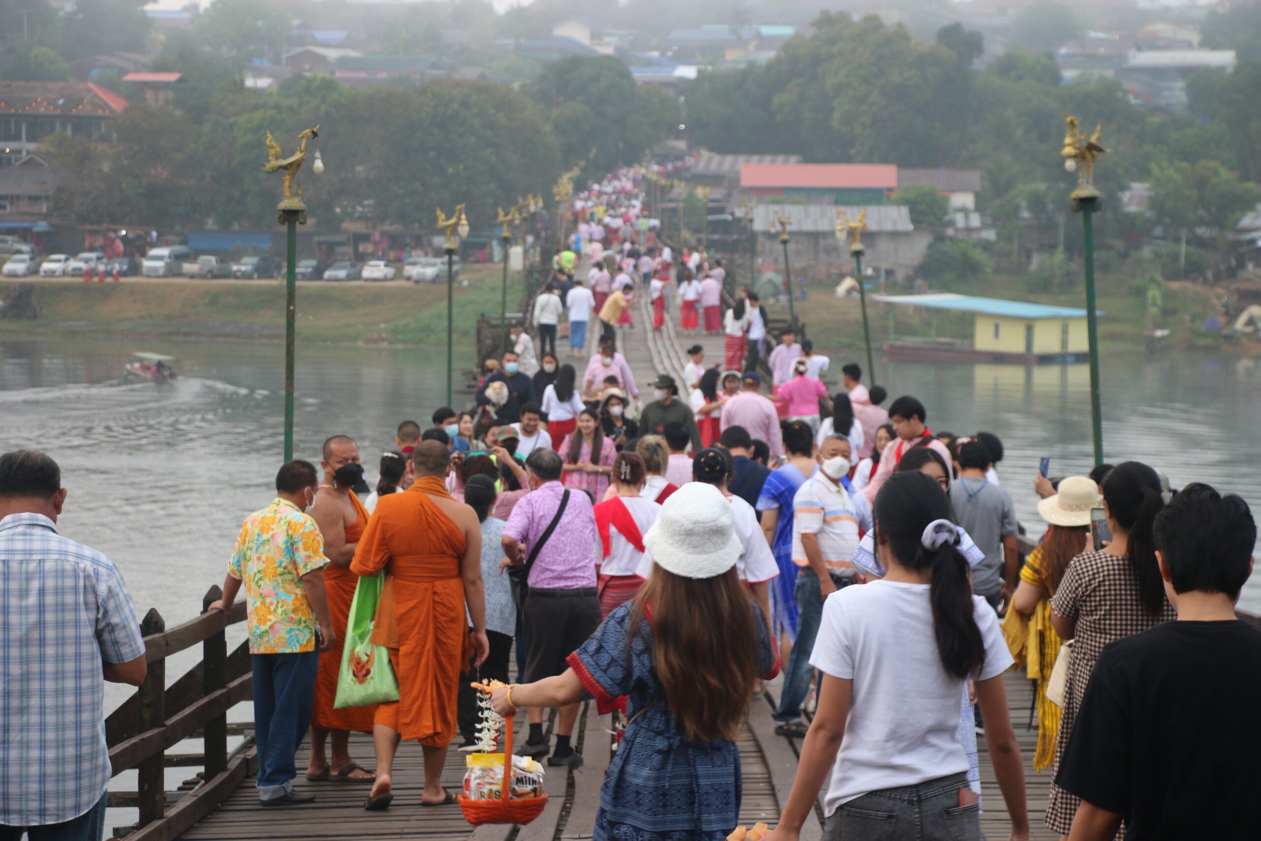 เช้าวันนี้ 13 พฤศจิกายน 2565 ที่บริเวณสะพานอุตตมานุสรณ์(สะพานไม้)และชุมชนมอญบ้านวังกะ สถานที่ท่องเที่ยวสำคัญของอำเภอสังขละบุรี จังหวัดกาญจนบุรี เต็มไปด้วยนักท่องเที่ยวตั้งแต่บนสะพานต่อเนื่องไปถึงในชุมชน ระยะทางกว่า 1.5 กิโลเมตร โดยนักท่องที่ยวส่วนใหญ่เป็นผู้สูงอายุที่มากับครอบครัวและหมู่คณะ ส่วนใหญ่เลือกสวมใส่ชุดพื้นเมือง ทั้งมอญ กะเหรี่ยง พม่า สีสันสวยงาม เดินจับกลุ่มถ่ายรูปเป็นหมู่คณะเพื่อเก็บไว้เป็นทีระลึก นอกจากนั้นบางคนยังได้ใช้โทรศัพท์มือถือทำการlive สด ผ่านบรรยากาศขณะท่องเที่ยวบนสะพาน ผ่านโลกโซเชี่ยลทั้งทาง FBและLine เพื่อให้เพื่อนๆและคนทางบ้านที่ไม่ได้มาได้มีโอกาสเห็นบรรยากาศที่สวยงามของสะพานไม้