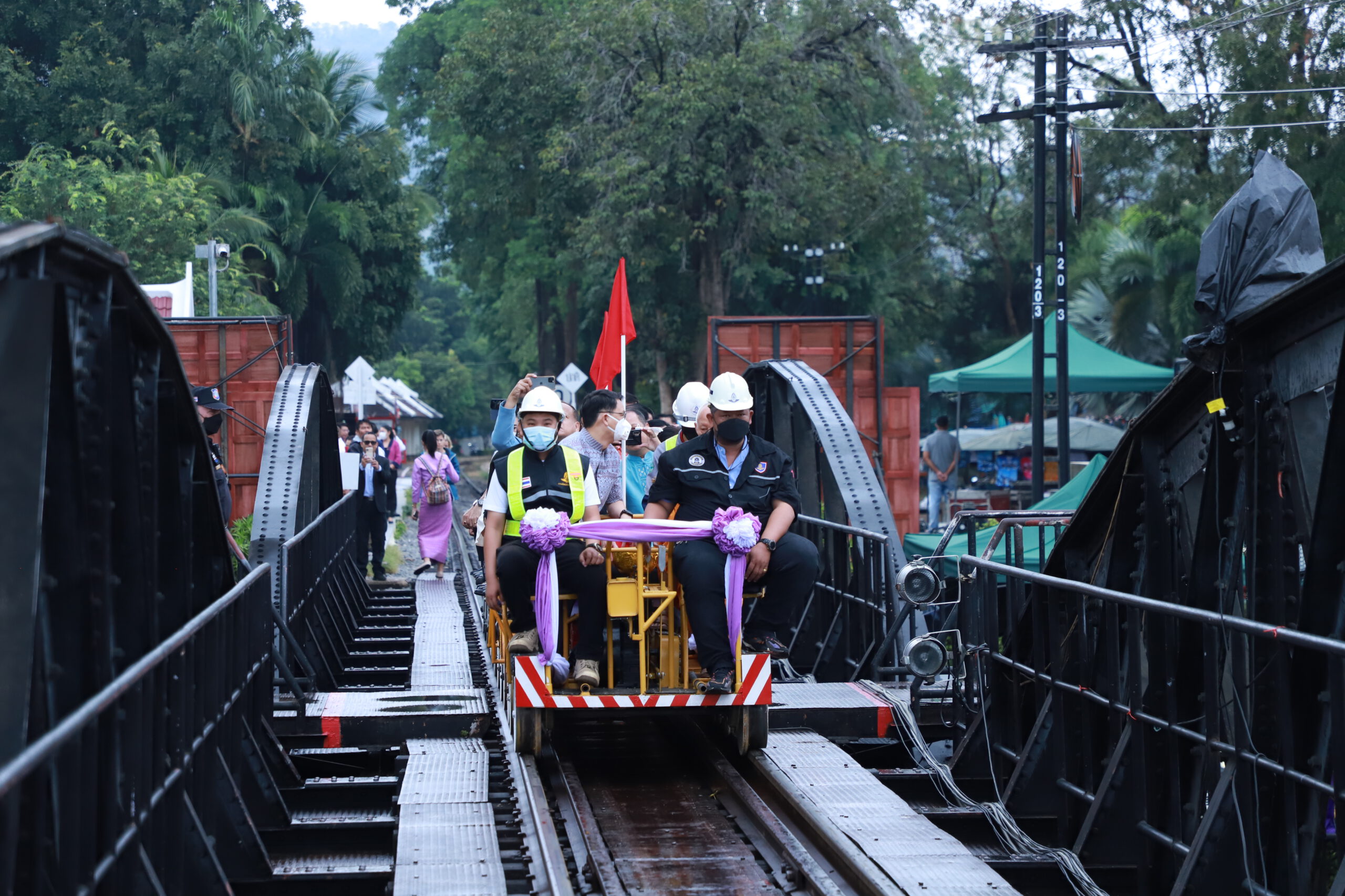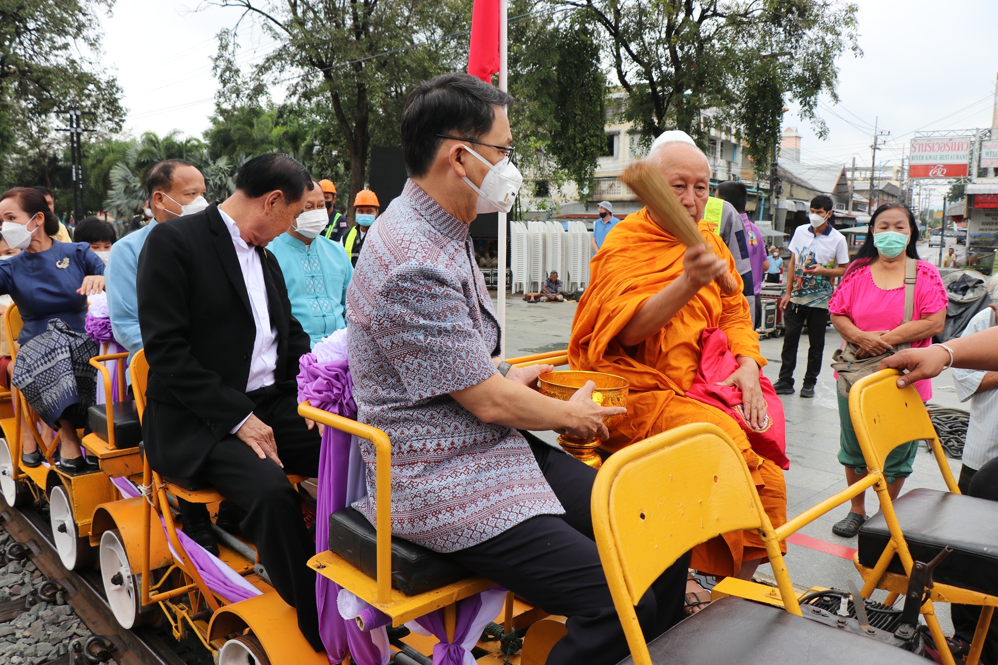 จากนั้นได้ประกอบพิธีบวงสรวงสักการะสิ่งศักดิ์สิทธิ์และประกอบพิธีกรรมทางศาสนา บริเวณสะพานข้ามแม่น้ำแคว เพื่อบวงสรวงสิ่งศักดิ์สิทธิ์และยังเป็นการอุทิศส่วนบุญส่วนกุศลให้แก่ผู้ล่วงลับและเหล่าเชลยศึกที่เสียชีวิตในการก่อสร้างสะพานข้ามแม่น้ำแคว ซึ่งเป็นสถานที่สำคัญทางประวัติศาสตร์เป็นสะพานที่สำคัญที่สุดของเส้นทางรถไฟสายมรณะ ในสมัยสงครามโลกครั้งที่ 2