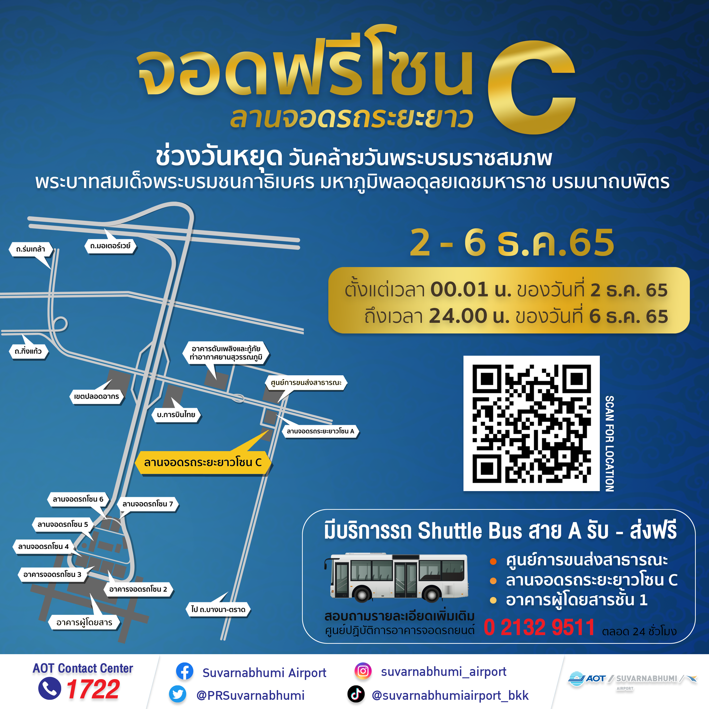 วันที่ 28 พฤศจิกายน 2565 ท่าอากาศยานสุวรรณภูมิ (ทสภ.) ยกเว้นอัตราค่าบริการจอดรถ ณ ลานจอดรถระยะยาว (Long Term Parking) โซน C ซึ่งสามารถรองรับได้จำนวน 718 คัน ทั้งนี้ ผู้โดยสาร ผู้ใช้บริการสามารถนำรถยนต์เข้ามาจอดฟรี ระหว่างวันที่ 2 – 6 ธันวาคม 2565 ตั้งแต่เวลา 00.01 น. ของวันศุกร์ที่ 2 ธันวาคม 2565 ถึงเวลา 24.00 น. ของวันอังคารที่ 6 ธันวาคม 2565 รวมทั้งสิ้น 5 วัน
