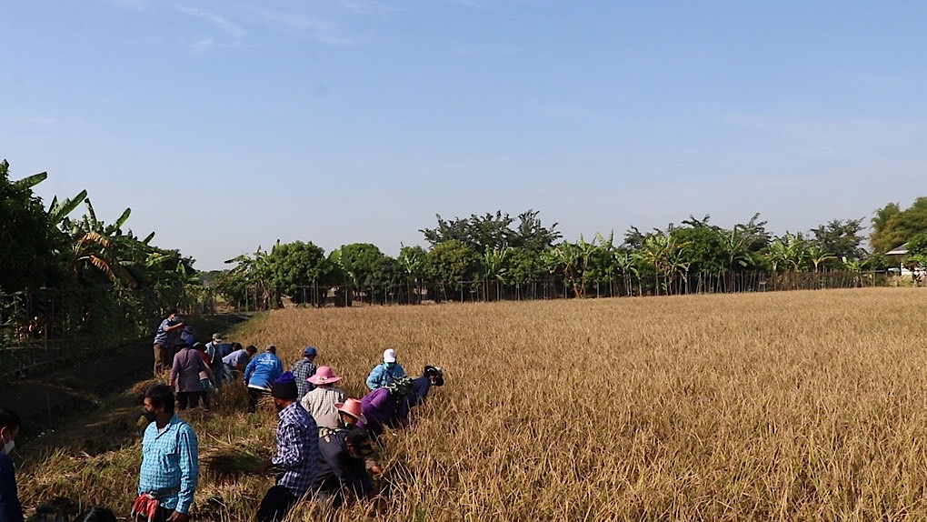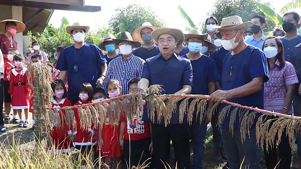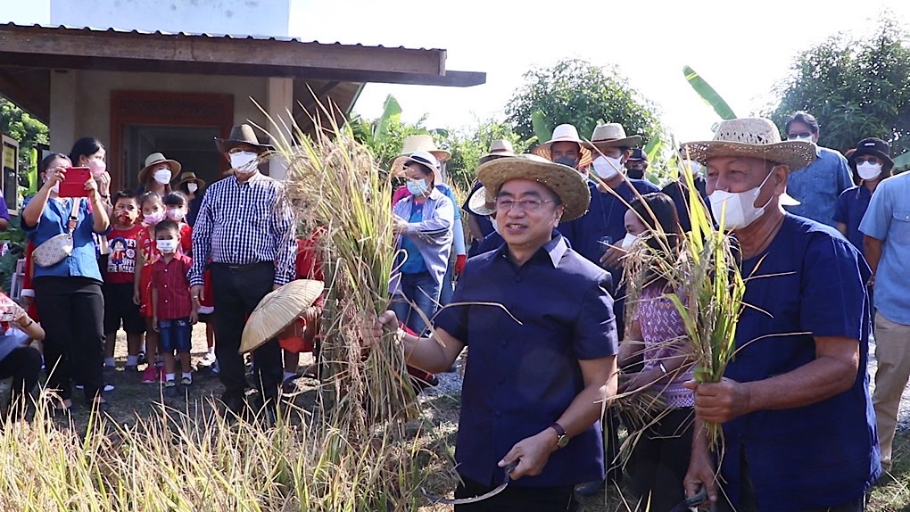 จังหวัดสิงห์บุรี เกี่ยวข้าว ตามโครงการศูนย์การเรียนรู้ตามรอยศาสตร์พระราชาสู่โคกหนองนาโมเดล