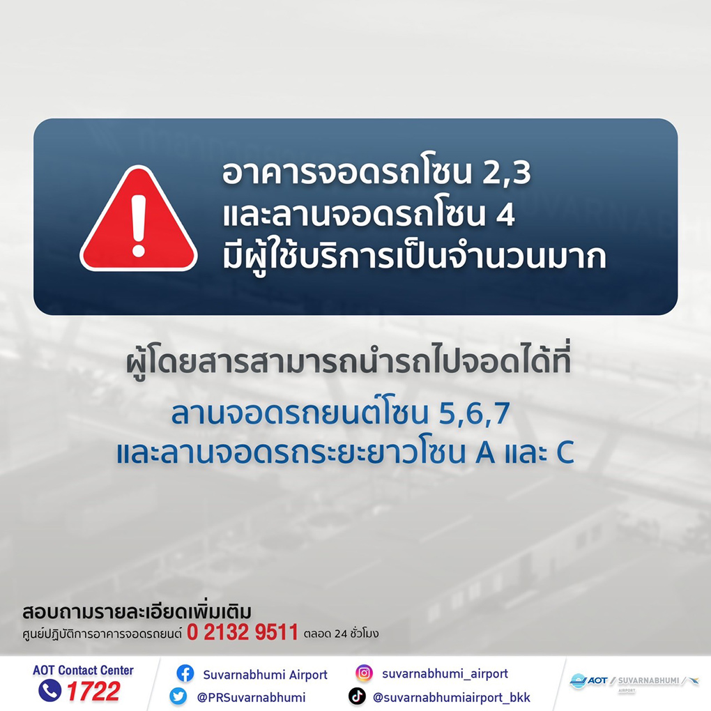*****วันที่ 29 ธันวาคม 2565 เนื่องด้วยช่วงวันหยุดยาวเทศกาลปีใหม่ 2566 มีผู้ใช้บริการท่าอากาศยานสุวรรณภูมิ (ทสภ.) นำรถยนต์ เข้ามาจอดที่อาคารจอดรถโซน 2 – 3 และลานจอดรถโซน 4 เป็นจำนวนมาก ซึ่งอาจทำให้ไม่ได้รับความสะดวก