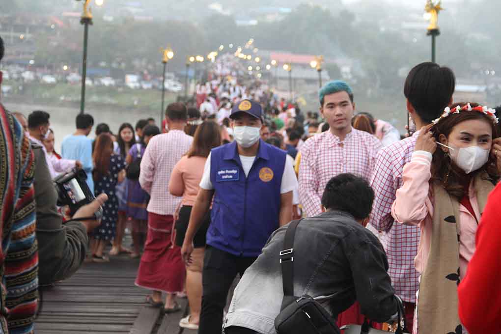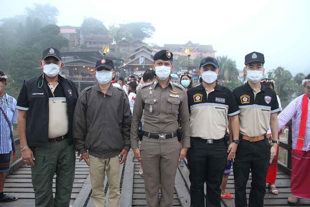 กาญจนบุรี นายอำเภอสังขละบุรีติดตามการจัดระเบียบบนสะพานฯ นักท่องเที่ยวทำบุญตักบาตรรับปีใหม่