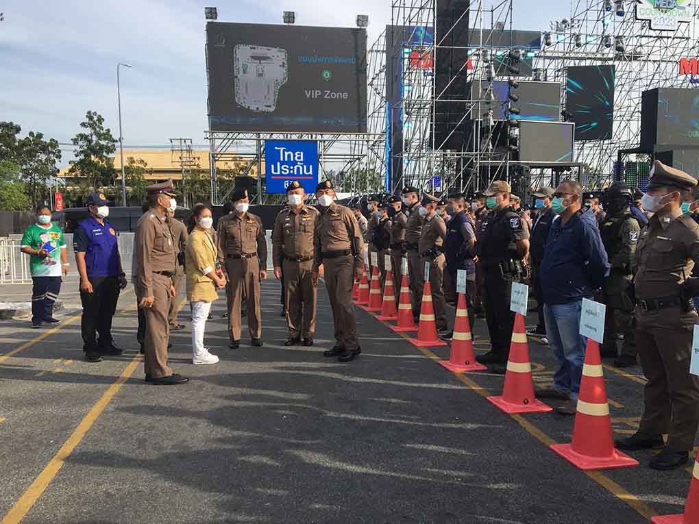 *****ขณะเดียวกัน ทางด้าน พล.ต.อ. ต่อศักดิ์ สุขวิมล รองผบ.ตร. เดินทางมาตรวจความเรียบร้อยและกำชับการปฎิบัติของเจ้าหน้าที่ผู้เกี่ยวข้อง โดยหลังจากที่เข้าร่วมประชุมและสั่งการข้อห่วงใยของ นายกรัฐมนตรี และผบตร แล้ว ได้ออกมาให้สัมภาษณ์ระบุว่า รัฐบาลและสำนักงานตำรวจแห่งชาติมีความห่วงใยประชาชนที่จะเข้าร่วมกิจกรรมเคาท์ดาวน์ในพื้นที่ต่างๆ ซึ่งนอกจากแผนการปฎิบัติที่วางไว้ด้านการรักษาความปลอดภัยและดูแลประชาชนแล้ว ในส่วนของตนเองยังมีความห่วงใยและได้กำชับการปฎิบัติไปยังตำรวจทั่วประเทศ เนื่องจากปีนี้เป็นการจัดกิจกรรมที่ห่างหายมานานจากสถานการณ์โควิดทำให้จะมีประชาชนออกมาท่องเที่ยวและเฉลิมฉลองในคืนนี้เป็นจำนวนมากอ ทำให้ต้องเน้นย้ำนำเอาบทเรียนจากการเกิดเหตุในอดีตที่ผ่านมา โดยเฉพาะไฟไหม้ในสถานบันเทิง มาถอดบทเรียนและปิดช่องว่างเพื่อไม่ให้เกิดเหตุซ้ำรอย โดยกำชับให้ตำรวจท้องที่ต้องไปตรวจและประชาสัมพันธ์ผู้ประกอบการสถานบันเทิง โดยเฉพาะสถานบันเทิงในที่ปิด ให้ตรวจสอบทางออกฉุกเฉินให้พร้อมใช้งานได้ตลอดเวลา รวมถึงการตรวจตราและขอความร่วมมือผู้ประกอบการห้ามจุดพลุหรือดอกไม้ไฟในสถานบันเทิง ซึ่งจะนำมาซึ่งเหตุการณ์ไฟไหม้ได้ นอกจากนั้นยังกำชับเรื่องระบบแสงสีเสียงที่จะป้องกันไม่ให้เกิดไฟฟ้าลัดวงจรปิดจนลุกไหม้และลุกลาม นอกจากห่วงใยเรื่องการจุดดอกไม้ไฟในสถานบันเทิงและ จะต้องมีการควบคุมไม่ให้นำอาวุธและยาเสพติดเข้าไปในสถานบริการ หากพบว่าท้องที่ไหนปล่อยปะละเลยให้มีการนำเอายาเสพติด อาวุธ และปล่อยให้มีเยาวชนเข้าไปใช้บริการ ถือเป็นความบกพร่องของตำรวจในพื้นที่ ต้องออกมารับผิดชอบ รวมถึงการตั้งด่านตรวจควบคุมผู้ที่เมาแล้วขับเพราะเป็นความสูญเสียต่อชีวิตและทรัพย์สินของประชาชน ทั้งนี้ตนเองต้องขอความร่วมมือไปยังผู้ประกอบการให้งดการจุดดอกไม้ไฟในค่ำคืนนี้