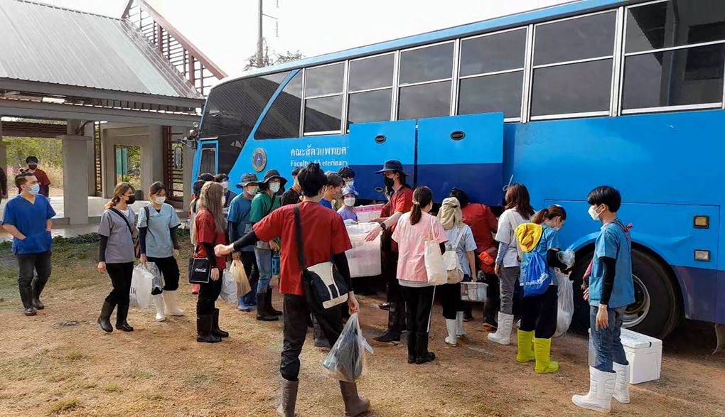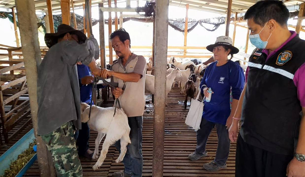 กาญจนบุรี ปศุสัตว์กาญจน์นำนักศึกษาคณะสัตวแพทย์ศาสตร์ ม.มหิดลร่วมทำกิจกรรมตรวจสุขภาพและฉีดยาฆ่าเชื้อคอกแพะ
