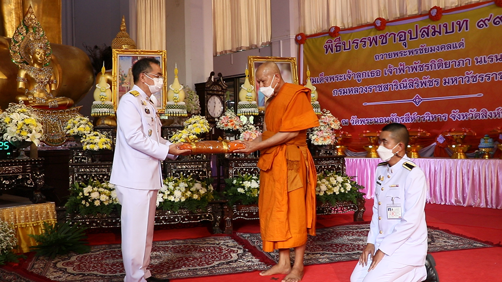 จังหวัดสิงห์บุรีจัดพิธีบรรพชาอุปสมบท 99 รูป ถวายพระพรชัยมงคลแด่สมเด็จพระเจ้าลูกเธอ เจ้าฟ้าพัชรกิติยาภา นเรนทิราเทพยวดี กรมหลวงราชสาริณีสิริพัชร มหาวัชรราชธิดา ณ วัดพระนอนจักรสีห์วรวิหาร จังหวัดสิงห์บุรี