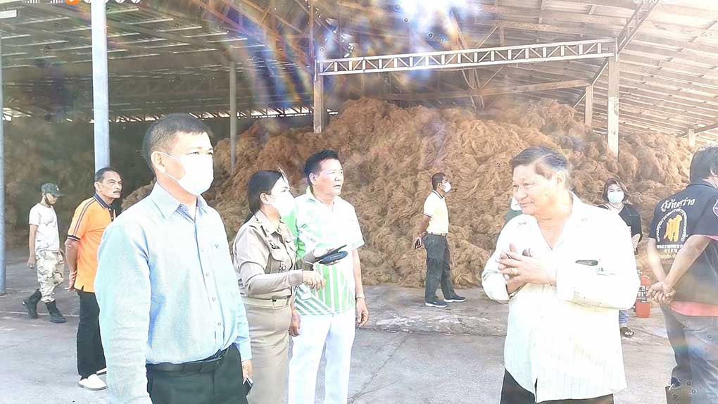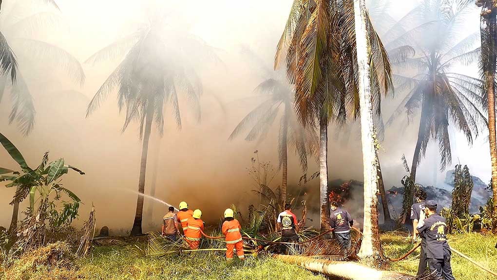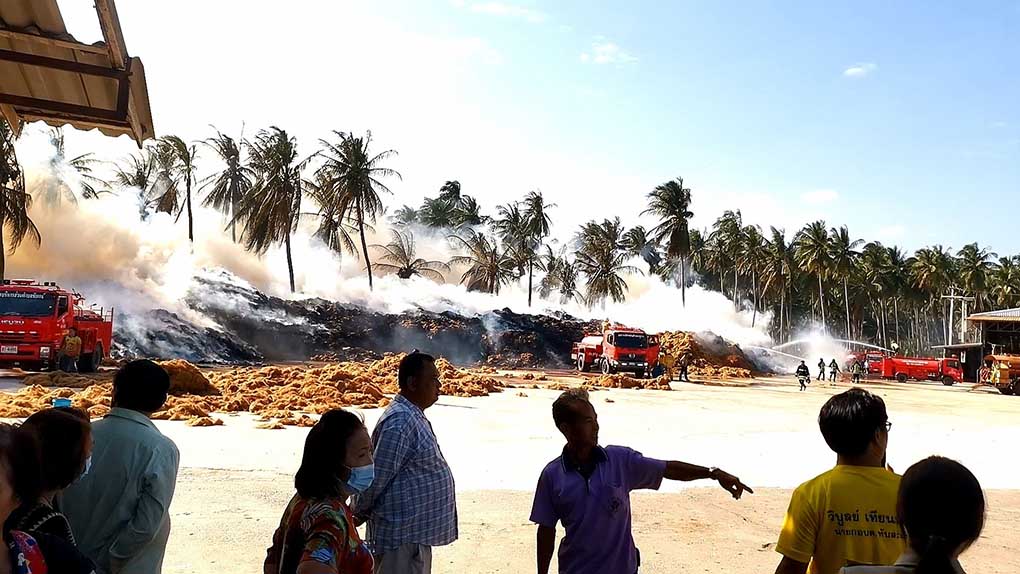 โดยเพลิง ได้ลุกไหม้ที่บริเวณกองขี้ใยนอกโรงงานที่อยู่ในป่ามะพร้าวข้างๆทำให้ไฟลุก อย่างรุนแรง เนื่องจากลมกระโชคแรง เจ้าหน้าที่พร้อมพนักงานโรงงานได้นำรถไถ รถตัก มาดันหญ้ากันไฟ เนื่องจากใต้กองใยที่ไฟได้ไหม้อย่างรุนแรง มีบ้านชาวบ้านอยู่ 1 หลัง เจ้าหน้าที่ต้องนำคนภายในบ้านออกไปก่อน พร้อมระดมฉีดน้ำ เพื่อไม่ให้ลุกลามขยายวงกว้าง ทำให้ต้นมะพร้าวที่อยู่ติดกับกองใยถูกไฟลุกไหม้หลาย 10 ต้น
