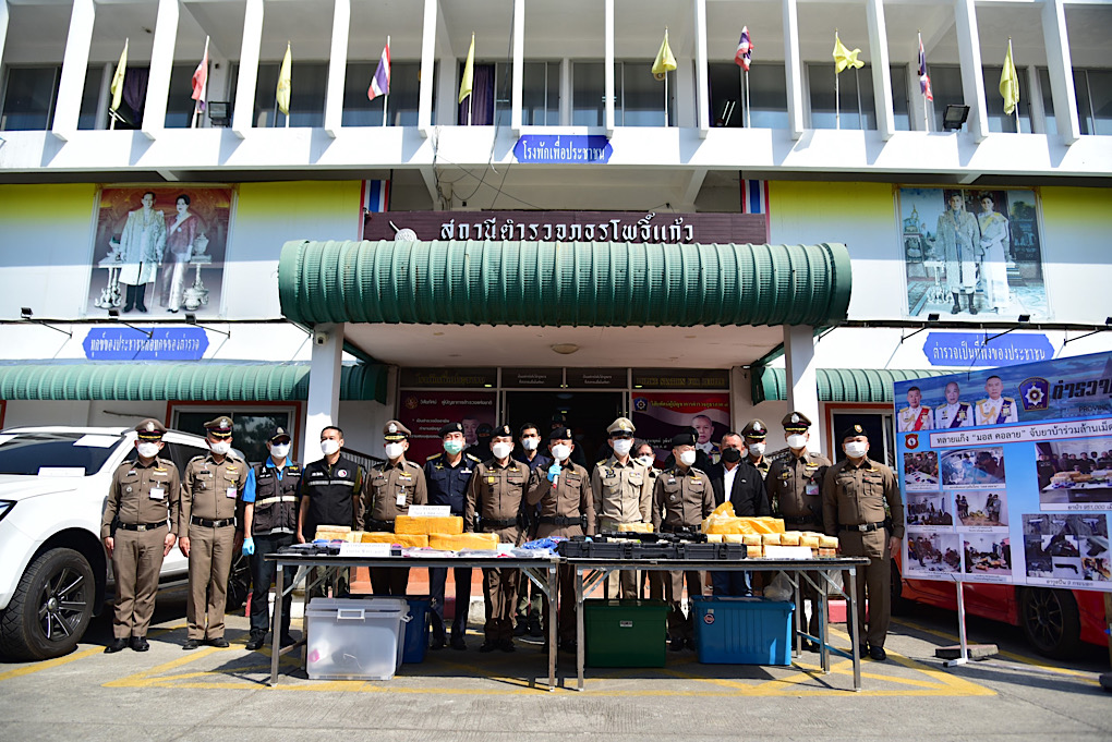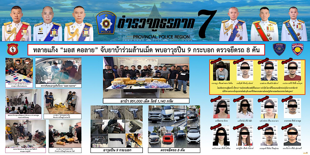 วันที่ 31 มกราคม 2566 2566 ที่บริเวณหน้าสถานีตำรวจภูธรโพธิ์แก้ว อำเภอสามพราน จังหวัดนครปฐม พล.ต.ท.ธนายุตม์ วุฒิจรัสธำรงค์ ผู้บัญชาการตำรวจภูธรภาค7 พร้อมด้วย นายสุรศักดิ์ เจริญศิริโชติ ผู้ว่าราชการจังหวัดนครปฐม พล.ต.ต.บุญญฤทธิ์ รอดมา รองบัญชาการตำรวจภูธรภาค7 พล.ต.ต.วรายุทธ สุขวัฒน์ รองบัญชาการตำรวจภูธรภาค7 พล.ต.ต.ชมชวิณ ปุระธนานนท์ รองบัญชาการตำรวจภูธรภาค7 พล.ต.ต.จักรกฤษ เครือสุนทรวานิช ผู้บังคับการตำรวจภูธรจังหวัดนครปฐม พล.ต.ต.ประสพชัย มัตสยะวนิชกูล ผู้บังคับการสืบสวนสอบสวนตำรวจภูธรภาค 7 พล.ต.ต.ปรีดา อิ่มเจริญ บังคับการศูนย์ฝึกอบรมตำรวจภูธรภาค 7 พ.ต.อ.พงษกร อุปพงษ์ รองผู้บังคับการตำรวจภูธรจังหวัดนครปฐม พ.ต.อ.กัมปนาท ณ.วิชัย ผู้กำกับการ สภ.โพธิ์แก้ว เจ้าหน้าที่ชุดสืบสวนกองบังคับการสืบสวนสอบสวนตำรวจภูธรภาค7 พร้อมเจ้าหน้าที่ที่เกี่ยวข้อง ร่วมแถลงผลการจับกุมกลุ่มขบวนการยาเสพติดรายใหญ่ผู้ต้องหาจำนวน 12 คน (หรือแก๊งมอส คอลาย) พร้อมของกลางยาบ้า จำนวน 475 มัดเศษ รวมประมาณ 951,000 เม็ด ไอซ์ น้ำหนักประมาณ 1,140 กรัม อาวุธปืน จำนวน 8 กระบอก รถยนต์กระบะ จำนวน 1 คัน สมุดบัญชีเงินฝาก เครื่องกระสุนปืนขนาดต่างๆ และของกลางอื่นๆจำนวนมาก กอ.รมน.จังหวัดนครปฐม ภายใต้การนำของ พันเอกพงษ์สวัสดิ์ ภาชนะทิพย์ รองผู้อำนวยการรักษาความมั่นคงภายในจังหวัดนครปฐม ได้ร่วมกันจับกุมผู้ต้องหาแก๊งยาเสพติด จำนวน 12 คน