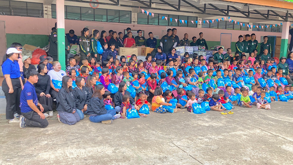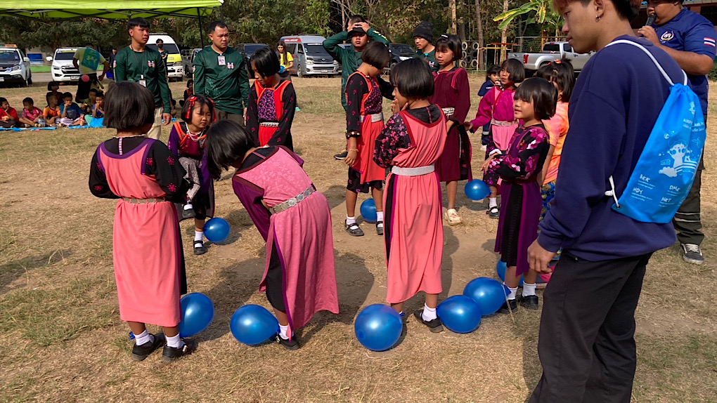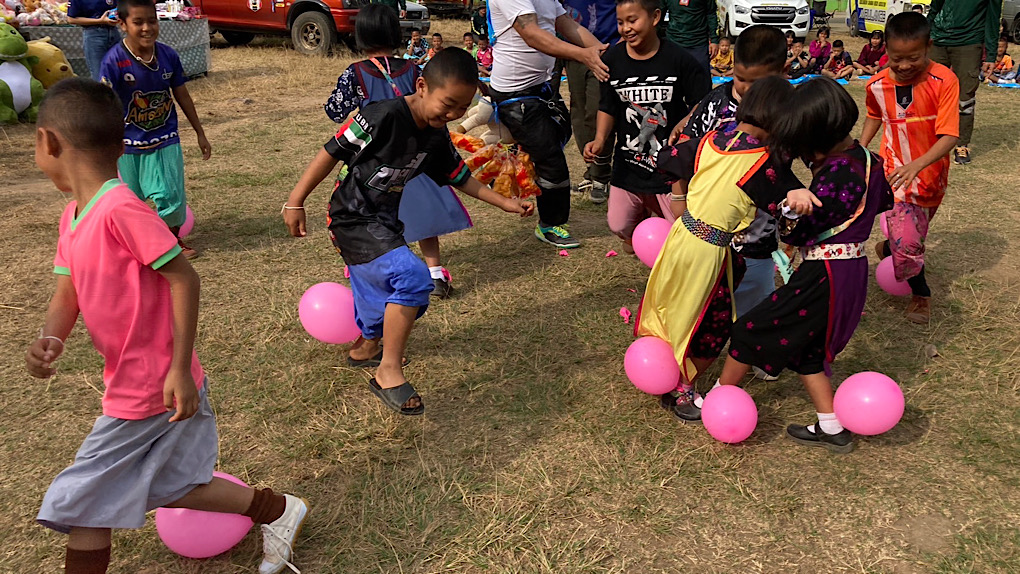 ทั้งที่ออกมาเล่นเกมและนั่งชม ยังให้เจ้าหน้าที่และคุณครูของโรงเรียนบ้านห้วยต้นตอง ร่วมเล่นเกมสนุกสนานให้กับเด็กๆชม เด็กทุกคนมีความสุข และได้รับสิ่งของขนม ของเล่นใสย่ามกลับบ้านอย่างมีความสุข ในหมู่บ้านนี้ห่างไกลจากในเมืองไชยปราการประมาณ 40 กิโลเมตร ถนนหนทางเป็นถนนลาดยางมีหลุ่มมีบ่อเป็นปกติเพราะน้ำป่ากัดเซาะพังตามกาลเวลาขับรถต้องระมัดระวังกันมาก เด็กๆน้อยคนที่จะได้มีโอกาสเล่นเกมสนุกๆและมีเครื่องเล่นขนม ที่แตกต่างจากในเมือง การขาดแคลนเครื่องกันหนาวนั้นก็มีทุกปี อันเก่าก็ฉีกขาดไป เจ้าหน้าที่ชุดกู้ภัยมูลนิธิสงเคราะห์เชียงใหม่ ได้นำทั้งผ้าห่มกันหนาว เสื้อผ้าเด็ก ของเล่นเด็กมามอบให้กับทางคณะครูเพื่อแจกกับครอบครัวเด็กๆซึ่งมีตามรายชื่อที่คณะครูได้สำรวจเอาไว้แล้วล่วงหน้า ของเล่นบางอย่างมอบให้กับทางโรงเรียนเพื่อใช้กับนักเรียนในโรงเรียนฝึกทักษะสมองในการเล่นการคิด ถือว่าเด็กๆได้รับสิ่งที่ขาดหายไปในช่วงวันเด็กที่ผ่านมาได้มาเล่นสนุกและขนมต่างๆทุกคนในวันนี้ เจ้าหน้าที่ต้องขับรถมากางเต้นนอนกันเพื่อให้เด็กๆมีความสุข