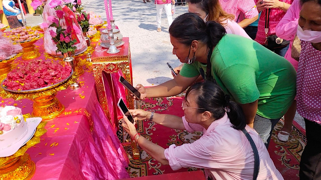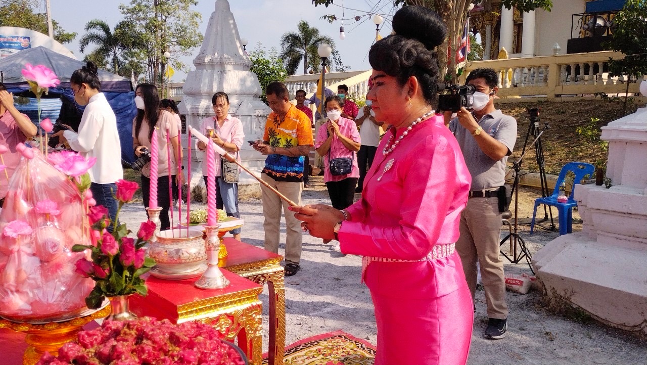 สุพรรณบุรี วันวาเลนไทน์ขอพรหลวงพ่อสีชมพูลุ้นเลขหางประทัดคึกคัก