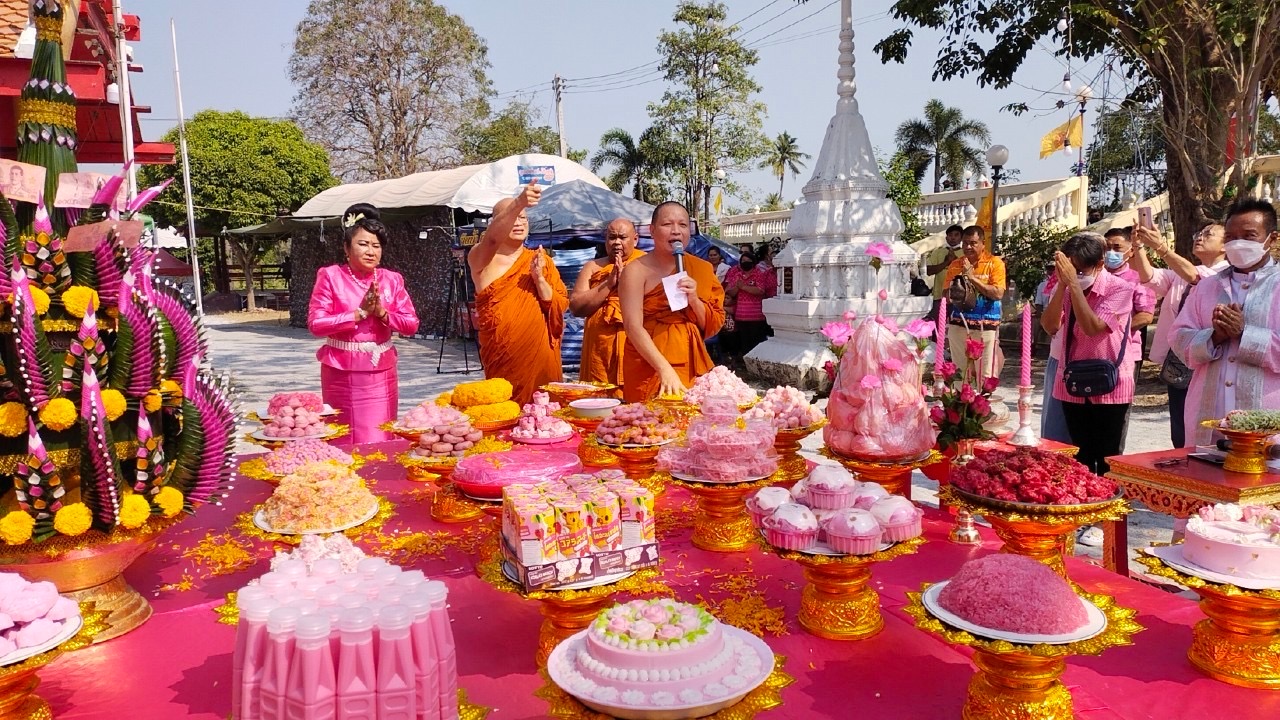 ในพิธีมีอาหาร คาวหวาน ผลไม้ เครื่องดื่ม 24 อย่าง สีชมพู มาบวงสรวงและถวายหลวงพ่อสีชมพู เช่น ขนมเค้กสีชมพู 1.ขนมสาลี ขนมถ้วยฟู มะพร้าวแก้ว ผัดหมี่ มันชมพู ขนมเปี๊ยะ ขนมโก๋ ลูกกวาด .ซาลาเปา หมั่นโถ ขนมกุ่ยฉ่าย ขนมจีบ ขนมชั้น วุ้น สลิ่ม ข้าวเหนียวแก้วโดนัท ไข่เยี่ยวม้า นมเย็น ขนมมัน ขนมถั่วแปป ขนมต้ม โอริโอ้ ทุกอย่างเป็นสีชมพู วันวาเลนไทน์ปีนับเป็นมหามงคล ตรงกับวันอังคาร และยังเป็นวันครบรอบวันเกิดหลวงพ่อสีชมพู ครบ11 ปี มีประชาชนนักท่องเที่ยวและคู่รักทุกรุ่นทุกวัย ส่วนมากแต่งตัวด้วยเสื้อผ้าชุดสีชมพูนำดอกกุหลาบสีชมพู และร่มสีชมพู มาถวายหลวงพ่อสีชมพูในวันเลนไทน์ กันอย่างต่อเนื่อง