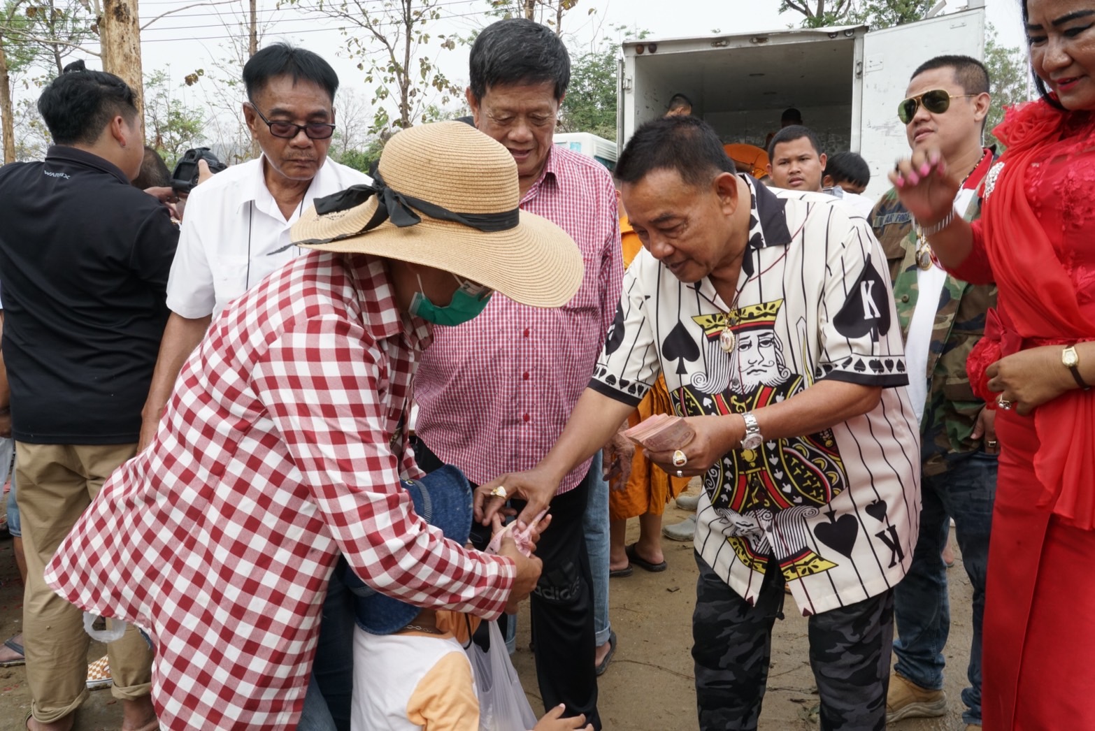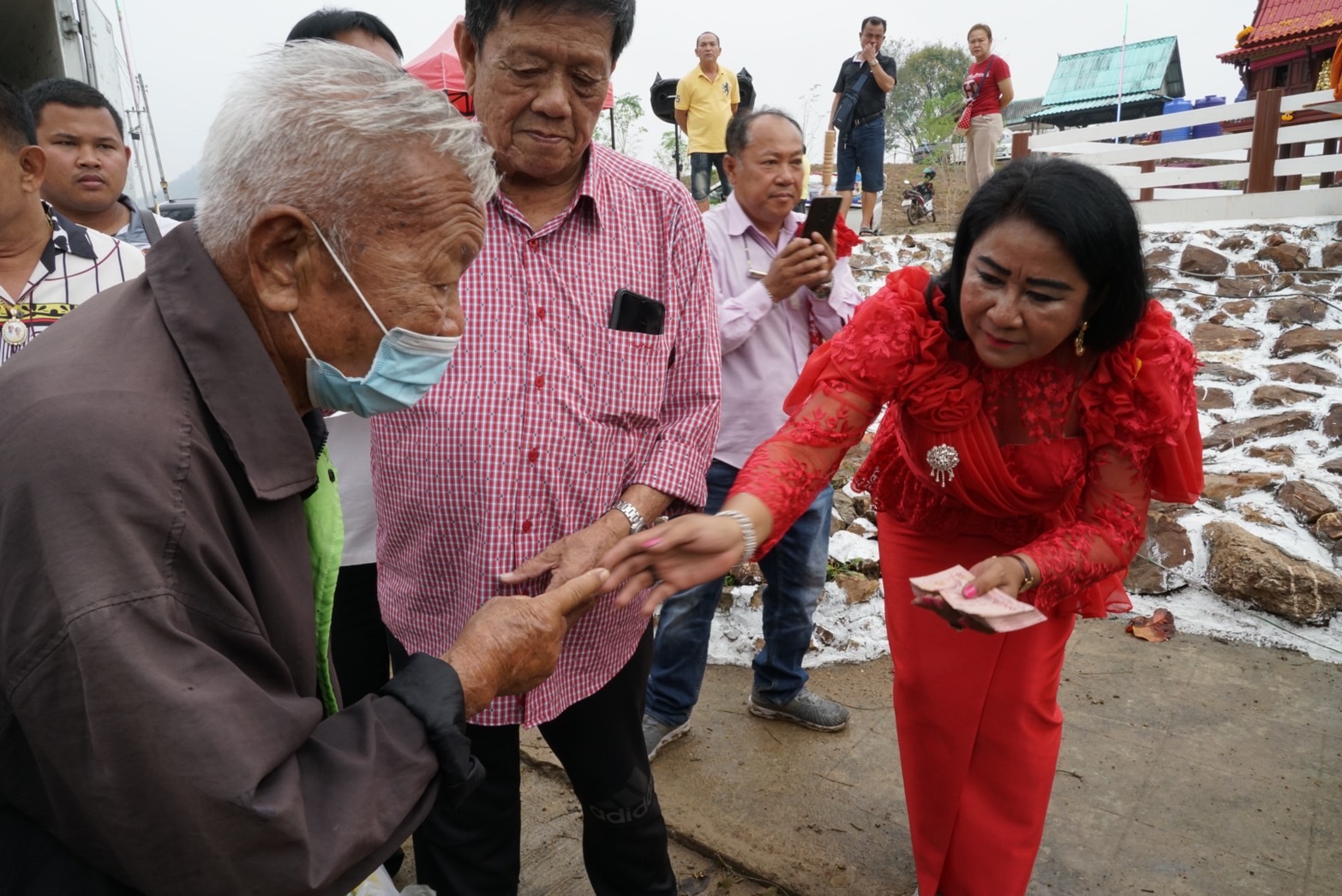 หลวงพี่น้ำฝนนำจ่ามีพร้อมกรรมการมูลนิธิหลวงพ่อพูลตั้งศาลปู่โสมเฝ้าทรัพย์ และแจกข้าวสารชาวบ้าน