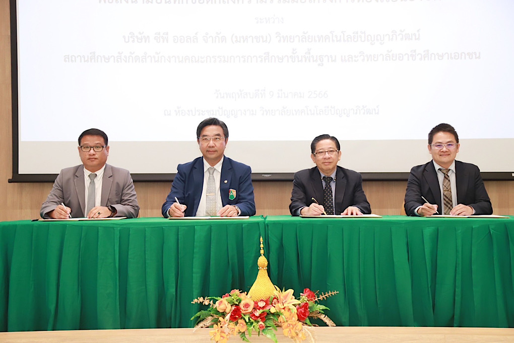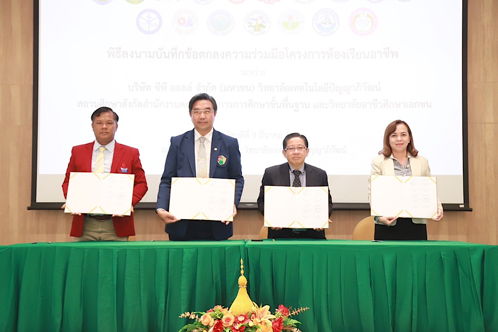 ที่วิทยาลัยเทคโนโลยีปัญญาภิวัฒน์ อ.เมือง จ.นนทบุรี วิทยาลัยเทคโนโลยีปัญญาภิวัฒน์โดยบริษัท ซีพี ออลล์ จำกัด (มหาชน) ร่วมกับสถานศึกษาในสังกัดสำนักงานคณะกรรมการการศึกษาขั้นพื้นฐาน และวิทยาลัยอาชีวศึกษาเอกชนในความร่วมมือ จัดพิธีลงนามบันทึกข้อตกลงความร่วมมือทางวิชาการ (MOU) จัดการเรียนการสอนโครงการห้องเรียนอาชีพเพื่อประสานความร่วมมือในการจัดการศึกษาสายอาชีพในสายสามัญ ผลิตและพัฒนากำลังคนให้สอดคล้องกับความต้องการของสถานประกอบการ โดยมุ่งเน้นให้นักเรียนได้รับความรู้ด้านสายอาชีพ ผ่านการจัดการเรียนการสอนในระดับมัธยมศึกษาตอนปลาย ตามแผนการเรียนที่เกี่ยวข้อง โดยให้นักเรียนได้เรียนรู้ในรายวิชาที่เป็นความรู้พื้นฐานด้านวิชาชีพ รวมถึงการศึกษาดูงานในสถานประกอบการ และส่งเสริมสนับสนุนให้นักเรียนได้พัฒนาการเรียนรู้ในสายอาชีพ โดยได้รับเกียรติจากนายปิยะวัฒน์ ฐิตะสัทธาวรกุล รองประธานกรรมการบริหาร บริษัท ซีพี ออลล์ จำกัด (มหาชน) เป็นประธานในพิธี พร้อมร่วมลงนามกับ นายวิเชียร เนียมน้อม ผู้แทนผู้รับใบอนุญาตและผู้อำนวยการวิทยาลัยเทคโนโลยีปัญญาภิวัฒน์ ,สถานศึกษาในสังกัดสำนักงานคณะกรรมการการศึกษาขั้นพื้นฐาน และวิทยาลัยอาชีวศึกษาเอกชนในความร่วมมือ จำนวน 17 แห่ง