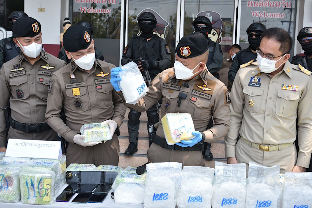 1. ยาเสพติดให้โทษประเภท 1 (เมทแอมเฟตามีนหรือยาไอซ์) ชนิดเป็นเกล็ดสีขาว บรรจุอยู่ในซองห่อชาสีเหลือง-เขียว จำนวน 100 ห่อ น้ำหนักห่อละประมาณ 1 กิโลกรัม น้ำหนักรวมสิ่งห่อหุ้มประมาณ 100 กิโลกรัม บรรจุอยู่ในถุงพลาสติกสีดำลักษณะเป็นแพ็ค พันด้วยกระดาษกาวสีเหลืองอ่อนบรรจุอยู่ในกระสอบปุ๋ยสีรุ้ง ห่อหุ้มด้วยถุงพลาสติกสีม่วง (แพ็คละ 50 ห่อ) ซุกซ่อนอยู่ในตู้ทึบภายในรถยนต์กระบะ
