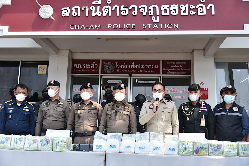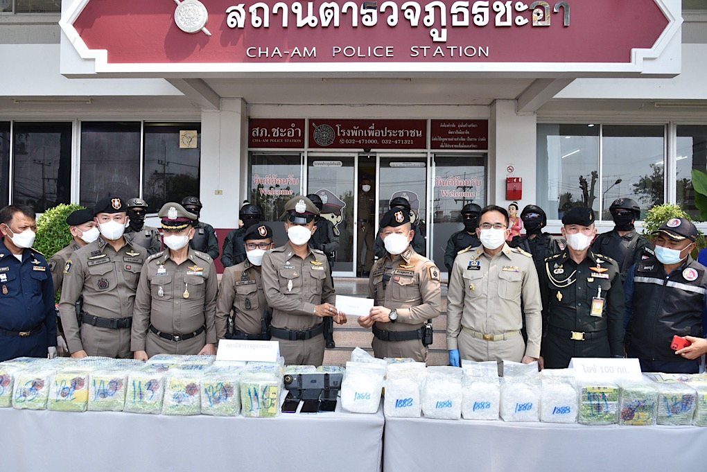 วันที่ 15 มี.ค. 66 พล.ต.ท.ธนายุตม์ วุฒิจรัสธำรงค์ ผบช.ภ.7พร้อมด้วยพล.ต.ต.วรายุทธ สุขวัฒน์รอง ผบช.ภ.7 พล.ต.ต.ปิติ นฤขัตรพิชัย ผบก.ภ.จว.เพชรบุรี นายปิยพงศ์ ชูวงศ์รองผู้ว่าราชการจังหวัดเพชรบุรี พ.ต.อ.กานต์ ธรรมเกษม รอง ผบก.ภ.จว.เพชรบุรี พ.ต.อ.ธัญญะ ครุฑเผือก รอง ผบก.ภ.จว.เพชรบุรี พ.อ.สุรศักดิ์ มรกตจินดา เสนาธิการมณฑลทหารบกที่ 15 พ.อ.สนอง ธัญญานนท์ หัวหน้าฝ่ายกิจการมวลชนฯ กอ.รมน.เพชรบุรี พ.ต.อ.หญิง เอกจิตตรา มีไชยธร นวท.(สบ 4)พฐ.จว.เพชรบุร นายประสาร เกิดทอง รรท.ผอ.ส่วนบังคับใช้กฎหมาย พ.ต.อ.สมเกียรติ โฉมฉาย ผกก.สภ.ชะอำ พ.ต.อ.อภิชาติ พุทธบุญ ผกก.กก.3บก.สส.ภ.7 พ.ต.อ.ครรชิต โขวัฒนชัย ผกก.สส.ภ.จว.เพชรบุรี นายธีรพล ปรียานุภาพ ปลัดอำเภอชะอำ พร้อมเจ้าหน้าที่ที่เกี่ยวข้อง ร่วมแถลงผลการจับกุมผู้ต้องหาเครือข่ายยาเสพติด รวม 6 ราย