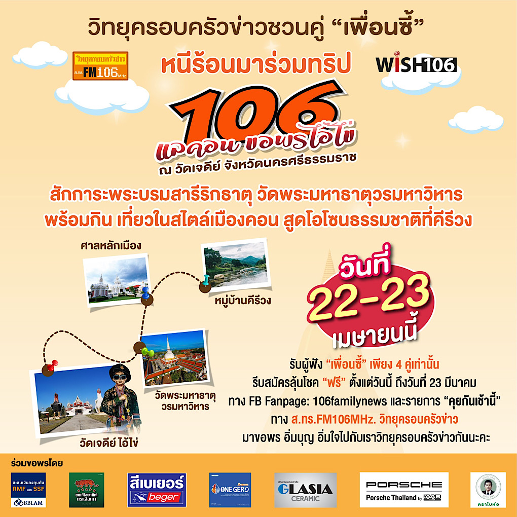 วิทยุครอบครัวข่าว ร่วมกับ ผู้สนับสนุนใจดี ชวนคู่ “เพื่อนซี้” หนีร้อนมาร่วมทริป “106 แลคอน ขอพรไอ้ไข่” ณ วัดเจดีย์ จังหวัดนครศรีธรรมราช และสักการะพระบรมสารีริกธาตุ วัดพระมหาธาตุวรมหาวิหาร พร้อมกิน เที่ยวในสไตล์เมืองคอน สูดโอโซนธรรมชาติที่คีรีวง ในวันที่ 22-23 เมษายนนี้ รับผู้ฟังคู่ “เพื่อนซี้” เพียง 4 คู่เท่านั้น รีบสมัครลุ้นโชค “ฟรี” ตั้งแต่วันนี้ถึงวันที่ 23 มีนาคม ทาง Facebook Fanpage: 106familynews และรายการ “คุยกันเช้านี้” ทาง ส.ทร.FM106MHz. วิทยุครอบครัวข่าว หรือติดต่อสอบถามเพิ่มเติมได้ที่ 02-4127668