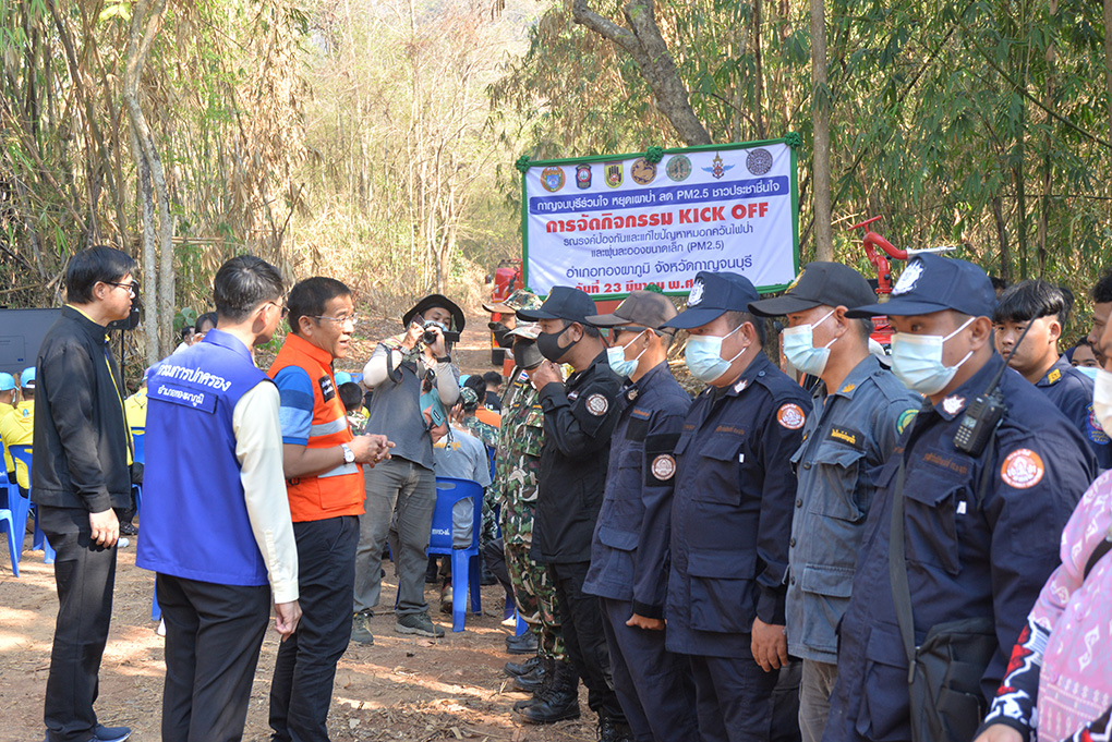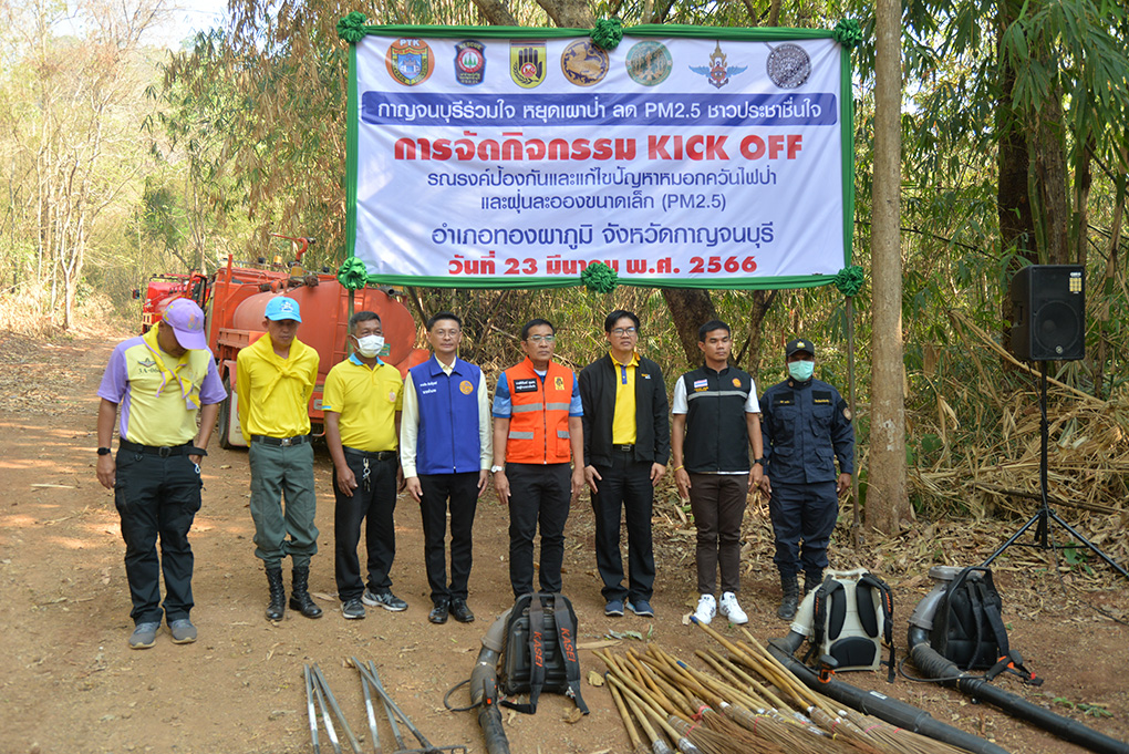 วันที่ 24มีนาคม 2566 ที่เขื่อนวชิราลงกรณ อำเภอทองผาภูมิ จังหวัดกาญจนบุรี นายศักรินทร์ ทุมเสน รองผู้ว่าราชการจังหวัดกาญจนบุรี เป็นประธานในพิธีเปิดกิจกรรม kick of รณรงค์ป้องกันและแก้ไขปัญหา หมอกควัน ไฟป่า และฝุ่นละอองขนาดเล็ก PM.2.5 ซึ่งในจังหวัดกาญจนบุรี มี 3 อำเภอที่มีจุดความร้อนสูงได้แก่ อำเภอไทรโยค อำเภอทองผาภูมิ อำเภอศรีสวัสดิ์ ซึ่งอำเภอทองผาภูมิ