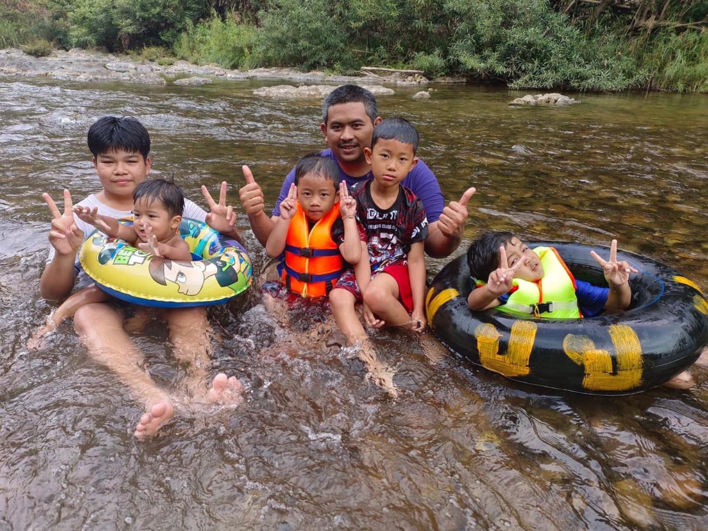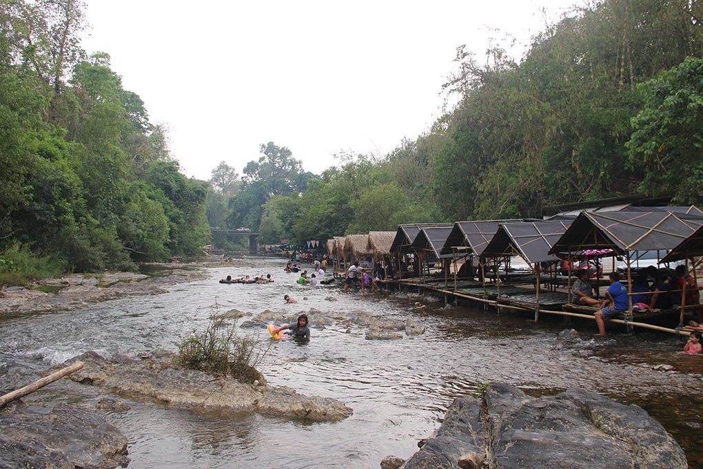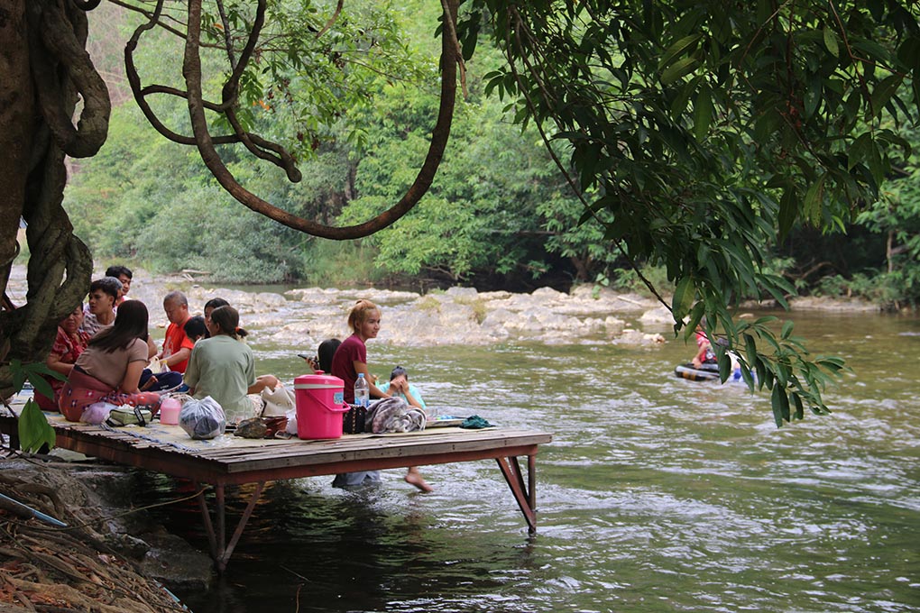 จากการลงพื้นที่พบว่าวันนี้มีผู้เดินทางพักผ่อนท่องเที่ยวเป็นจำนวนมาก จนที่จอดรถไม่เพียงพอ ทำให้ต้องจอดรถริมถนนทางเข้า ซึ่งส่วนใหญ่เป็นประชาชนจากหมู่บ้านต่างๆในพื้นที่อำเภอสังขละบุรี ที่พาครอบครัวมาพักผ่อนรับประทานอาหารริมน้ำ ที่มีให้เลือกทั้งอาหารตามสั่ง และจานด่วนจำพวก ส้มตำ ไก่ย่าง ลาบ น้ำตก เครื่องดื่ม และเล่นน้ำ เพื่อคลายร้อน ท่ามกลางธรรมชาติที่ร่มรื่นและสายน้ำมี่ไหลเย็น ใสสะอา