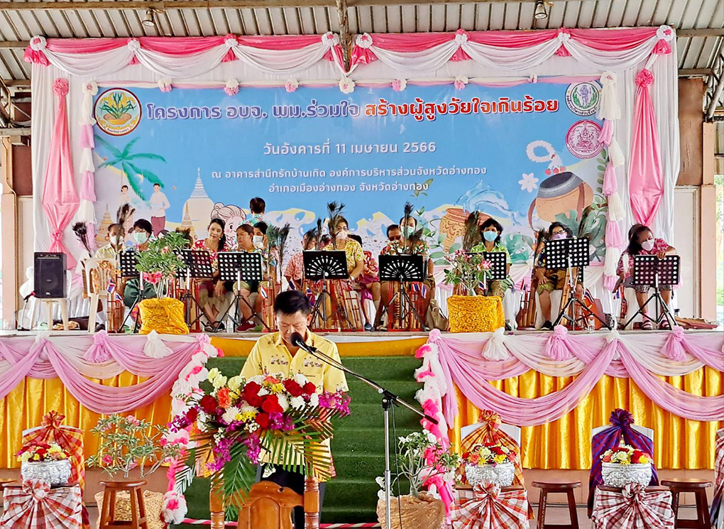 วันที่ 11 เมษายน 2566 เวลา 08.30 น. องค์การบริหารส่วนจังหวัดอ่างทองอ่างทอง ร่วมกับพัฒนาความมั่นคงของมนุษย์จังหวัดอ่างทอง จัดโครงการวันผู้สูงอายุ และวันแห่งครอบครัว ประจำปี 2566 ในช่วงเทศกาลวันสงกรานต์ (ปีใหม่ไทย) โดยมีนางสุภางค์ ทองมั่น พยาบาลวิชาชีพชำนาญการ โรงพยาบาลโพธิ์ทอง เป็นวิทยากรการจัดกิจกรรม และบรรยายให้ความรู้ ผู้สูงวัยใส่ใจสุขภาพ การถ่ายทอดภูมิปัญญาไทยให้ผู้สูงอายุได้รับรู้ กิจกรรมนันทนาการ การแสดงอังกะลุง การแสดงต่างๆของโรงเรียนผู้สูงอายุ โดยมีนายรังสรรค์ ตันเจริญ ผู้ว่าราชการจังหวัดอ่างทอง เป็นประธานในพิธี มีนายสุรเชษ นิ่มกุล นายก องค์การบริหารส่วนจังอ่างทอง กล่าวรายงาน