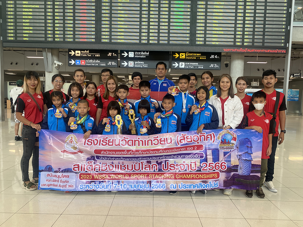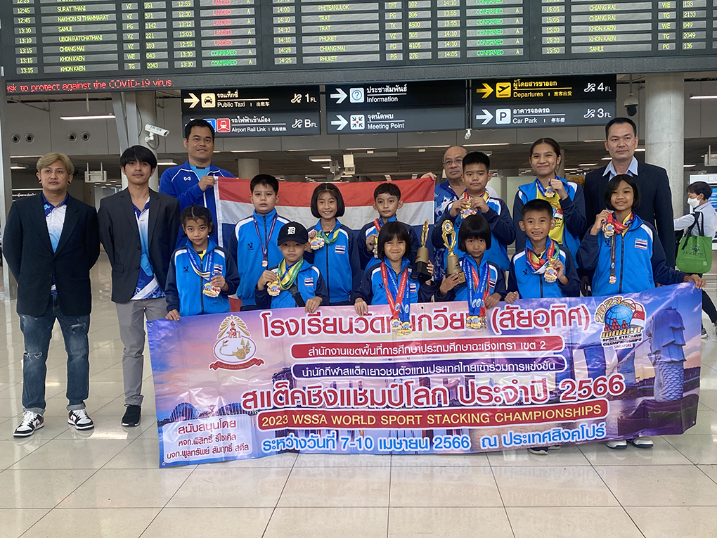 *****เมื่อเวลา 13.30น.วันที่ 11 เมษายน 2566 ที่ อาคารผู้โดยสาร สนามบินสุวรรณภูมิ ต.หนองปรือ อ.บางพลี จ.สมุทรปราการ นาย ปริวรรตน์ ไชยวรรธนิศพล กรรมการ นาย ฐกร พัตรปาน กรรมการ นาย ตันติกร โศภน เจนกิจ กรรมการ น.ส.ปิ่นปินัทธ์ ธีรสุขเสถียน กรรมการ สมาคมเรียงแก้วและกิจกรรมนันทนาการ เดินทางมาต้อนรับทีมนักกีฬาเรียงแก้วประเทศไทยที่เดินทางกลับจากการแข่งขันกีฬาสแต็คระดับโลก รายการ World Sport Stacking Championships 2023 ที่ประเทศสิงคโปร์ เมื่อวันที่ 7-9 เมษายน 2566 ที่ผ่านมา จำนวน 14 คน นักกีฬาตัวแทน สมาคมเรียงแก้วและกิจกรรมนันทนาการ จากโรงเรียนวัดท่าเกวียน(สัยอุทิศ),โรงเรียนเซนต์คาเบรียล,สถาบันเทคโนโลยีพระจอมเกล้าลาดกระบัง สามารถคว้ารางวัล
