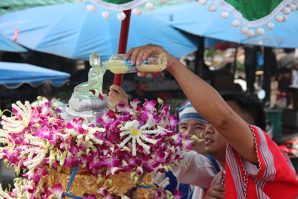 ส่วนบรรยากาศสงกรานต์สังขละบุรีเริ่มคึกคัก ประชาชนเริ่มออกมาเล่นน้ำท่ามกลางอากาศที่ร้อนระอุ เกือบ 40 องศาเซลเซียลในช่วงกลางวัน-บ่าย โดยวันนี้ชุมชนกะเหรี่ยงสังขละบุรี ร่วมกับวัดศรีสุวรรณ อำเภอสังขละบุรี และหน่วยงานที่เกี่ยวข้องจัดกิจกรรมแห่พระแก้วขาว พระพุทธรัตนสังขละบุรีศรีสุวรรณ( องค์จำลอง) รอบเมืองสังขละบุรี เพื่อให้ประชาชนและนักท่องเที่ยวได้สรงน้ำขอพร โดยมีพระครูกาญจนสุทธิคุณ(หลวงพ่อโจ่ละ)เจ้าอาวาสวัดศรีสุวรรณ ซึ่งเป็นพระภิกษุชาวกะเหรี่ยงที่ชาวอำเภอสังขละบุรี เลื่อมใสศรัทธา ร่วมขบวนเพื่อพรมน้ำมนต์ให้ประชาชนและนักท่องเที่ยว เพื่อความเป็นศิริมงคล ในวันสงกรานต์ โดยมีนายสุทธิพร ศิวเวทพิกุล นายอำเภอสังขละบุรี พ.ต.อ.ไพฑูรย์ ศรีวิลัย ผู้กำกับสถานีตำรวจภูธรสังขละบุรี ข้าราชการ ประชาชนชาวสังขละบุรี ร่วมในขบวนแห่ในครั้งนี้