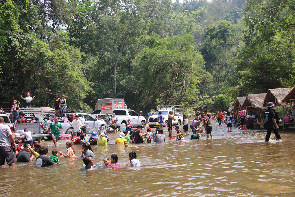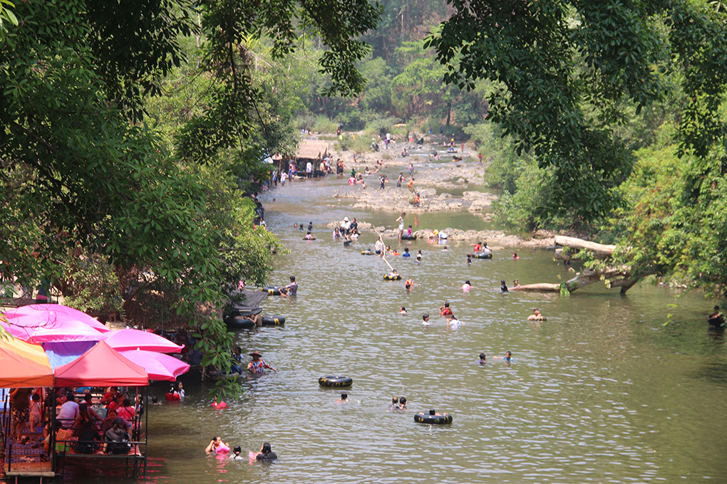 กาญจนบุรี บรรยากาศสงกรานต์สังขละบุรี นทท ชาวบ้านออกมาเล่นน้ำสงกรานต์คลายร้อนกลางแม่น้ำซองกาเลีย