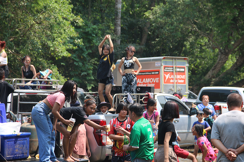 ขณะที่บริเวณจุดเล่นน้ำท่าล่างบ้านซองกาเลีย ประชาชนและนักท่องเที่ยวบางส่วนนำรถยนต์ลงมาในน้ำ พร้อมเล่นสาดน้ำ และเปิดเพลง เต้นท์อย่างสนุกสนาน นับเป็นสีสันใหม่ของวันสงกรานต์สังขละบุรี โดยคาดว่าในช่วงนี้จะมีนักท่องเที่ยวเดินทางมาเล่นน้ำคลายร้อนบริเวณจุดเล่นน้ำซองกาเลียรวมกันวันละไม่ต่ำกว่า 3000 คน ส่วนบรรยากาศในตัวเมืองสังขะบุรีมีการออกมาเล่นน้ำบนท้องถนนบ้างเล็กน้อย ซึ่งส่วนใหญ่จะเป็นเด็กๆ ที่ผู้ปกครองนำอุปกรณ์เล่นน้ำมาตั้งไว้ให้เพื่อให้บุตรหลานได้เล่นน้ำ คลายร้อน สร้างสีสันให้วันสงกรานต์สังขละบุรี สร้างความสุขและรอยยิ้มให้ผู้คนที่ขับรถผ่านไปผ่านมา