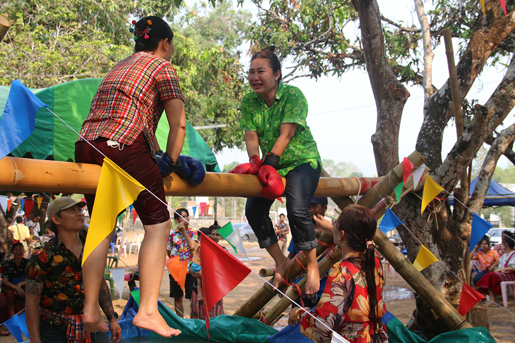 สงกรานต์กรานต์ที่นี่นอกจากประประกอบพิธีทางศาสนาแล้ว คณะกรรมวัดฯยังจัดให้มีการละเล่นสะบ้า การปีนเสาน้ำมัน และมวยทะเล ซึ่งเป็นการละเล่นที่เหมาะกับช่วงอากาศที่ร้อนในเดือนเมษายนนี้ โดยเปิดให้เล่นได้ทุกเพศทุกวัย โดยคู่ที่เรียกเสียงเชียร์และเสียงหัวเราะได้มากที่สุดเห็นจะเป็นคู่สุดท้ายในวันนี้ ที่ชกกันระหว่าง น.ส.วิไลพร สุขเจริญ (ผู้ช่วยพร)(อดีตผู้ช่วยผู้ใหญ่บ้าน หมู่ที่ 1 ตำบลหนองลู อำเภอสังขละบุรี จังหวัดกาญจนบุรี ที่จูงมือเพื่อรัก น.ส.อัญธิชา ธรรมวิเศษ (คุณนาย ยอด) ภรรยา พ.ต.ท.ภาวัต ธรรมวิเศษ สารวัตรสืบสวนสอบสวน พนมทวน ทั้งคู่เป็นเพื่อนสนิทที่รักกันมา โตมาด้วยกัน เรียน เที่ยว เล่น มาด้วยกันตั้งแต่เด็ก ผลการชกปรากฏว่าผู้ช่วยพร พลาดท่าปล่อยหมัดอัปเปอร์คัต วืดทำให้เซเข้าไปโดนฮุกขวาของคุณนายยอดที่ง้างหมัดขวารอ ส่งผลให้ผู้ช่วยพรร่วงลงน้ำไปก่อน ก่อนที่คุณนายยอดจะร่วงตาม ท่ามกลางเสียงเชียร์และเสียงหัวเราชอบใจของกองเชียร์ที่อยู่รอบๆเวที ซึ่งถือเป็นสีสันปิดท้ายสงประเพณีสงกรานต์วัดศรีสุวรรณ อำเภอสังขละบุรี ในปีนี้