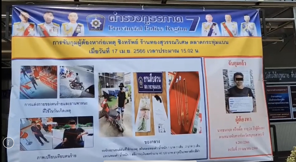 สำหรับผู้ต้องหารายนี้ เมื่อวันที่ 17 เมษายน 2566 เวลาประมาณ 15.00 น. ตำรวจได้รับแจ้งว่ามีเหตุชิงทรัพย์ร้านทองสุวรรณวิเศษ ต.ตลาดกระทุ่มแบน ได้ทรัพย์สินเป็นสร้อยคอทองคำ จำนวน 3 เส้นๆละ 2 บาท รวมหนัก 6 บาท เป็นเงิน ประมาณ 210,000 บาท สอบถามพยานในที่เกิดเหตุทราบว่าผู้ก่อเหตุ 1 คน สวมเสื้อแขนยาวสีเทา กางเกง ขายาว รองแตะ สวมใส่แมสสีขาว ใส่แว่นตาใส ใช้อาวุธลักษณะคล้ายปืนก่อเหตุชิงทรัพย์ หลังก่อเหตุหลบหนี ไปโดยรถจักรยานยนต์ฮอนด้าเวฟสีแดง ไม่ติดแผ่นป้ายมีตะกร้าหน้า จึงได้รายงานให้ผู้บังคับบัญชาทราบและ ได้ตรวจสอบกล้องวงจรปิดตลอดเส้นทางที่หลบหนี และข้อมูลบุคคลท้องถิ่น จนทราบว่าผู้ก่อเหตุ คือ นายธนกฤต กุ่ยสาคร อายุ 24 ปี จึงรวบรวมพยานหลักฐานเพื่อขออนุมัติ ศาลออกหมายจับ