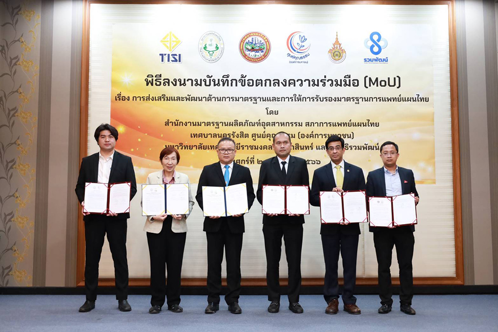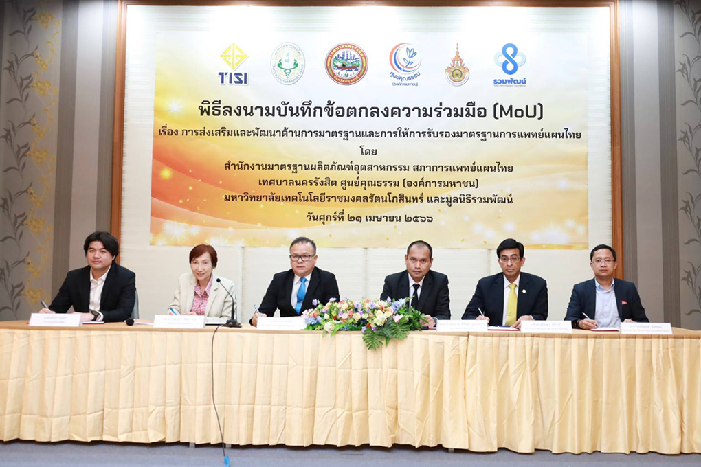 วันที่ 21 เมษายน 2566 ณ อาคารสํานักงานมาตรฐานผลิตภัณฑ์อุตสาหกรรม โดย รศ.นพ.สุริยเดว ทรีปาตี ผู้อํานวยการศูนย์ คุณธรรม ได้เข้าร่วมพิธีลงนามบันทึกข้อตกลงความร่วมมือในการส่งเสริมและพัฒนาด้านการมาตรฐานและการให้รับรอง มาตรฐานการแพทย์แผนไทย โดย สภาการแพทย์แผนไทย ได้ร่วมกับ สํานักงานมาตรฐานผลิตภัณฑ์อุตสาหกรรม ศูนย์คุณธรรม (องค์การมหาชน) มหาวิทยาลัยเทคโนโลยีราชมงคลรัตนโกสินทร์ มูลนิธิรวมพัฒน์ และ เทศบาลนครรังสิต เพื่อสร้างมาตรฐาน การแพทย์แผนไทย ทั้งในเรื่องเครื่องมืออุปกรณ์การแพทย์แผนไทย การนวดไทย การบําบัดรักษาด้วยสมุนไพร เช่น ขมิ้นชัน ฟ้า ทะลายโจร กัญชา กระท่อม ตลอดจนกรรมวิธีการแพทย์แผนไทยต่างๆ ทั้งที่สืบทอดมาจากอดีต และที่จะพัฒนาต่อยอด ประยุกต์เข้ากับเทคโนโลยีในปัจจุบัน เพื่อรองรับความต้องการในอนาคต รวมไปถึงมาตรฐานคุณธรรมของผู้ประกอบวิชาชีพและ ให้บริการด้านการแพทย์แผนไทย โดยมีพื้นที่เทศบาลนครรังสิตเป็นต้นแบบมาตรฐานสถานพยาบาลบูรณาการแพทย์แผนไทย เพื่อการให้บริการดูแลสุขภาพพร้อมสร้างเศรษฐกิจด้วยการแพทย์แผนไทยประจําชุมชนต่อไป