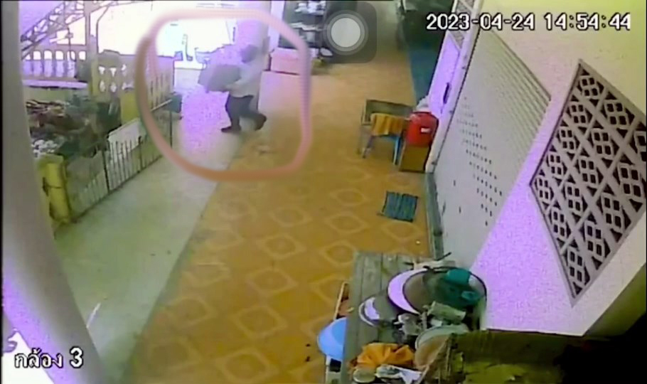 และช่วงสายวันที่ 24 เม.ย. ที่วัดมีงานศพ 2 ศพวัดกำลังยุ่ง อาตมาก็ไปกิจนิมนต์ข้างนอก กระทั่งเย็นกลับมาพบว่าตู้รับบริจาคที่ตั้งอยู่บนโต๊ะหน้ากุฏิ ของอาตมาไว้ให้ประชาชนญาติโยมมาทำบุญ ยาลม ยาหม่อง ยานวดคลายเส้น ที่อาตมาทำสงเคราะห์ชาวบ้าน ใครไปมา ก็มาเอาไป รวมถึงใครทำบุญอะไรก็จะนำเงินหยอดทำบุญใส่ตู้นี้ ซึ่งช่วงสงกรานต์มีคนมาเหมายาไปขาย และเอาเงินใส่ตู้บริจาคไว้ อาตมาและพระลูกวัดก็ยุ่งๆกันจึงไม่ได้เปิดตู้รับบริจาค ซึ่งมีเงินทำบุญน่าจะประมาณ 10,000 บาท ได้หายไป จึงมาเปิดกล้องดูก็พบมีคนร้ายเป็นชายและเป็นคนเดียวกันกับคนที่มาขอข้าวพระกิน และขอเงินเติมน้ำมันเป็นคนเข้ามาขโมยตู้บริจาคไป
