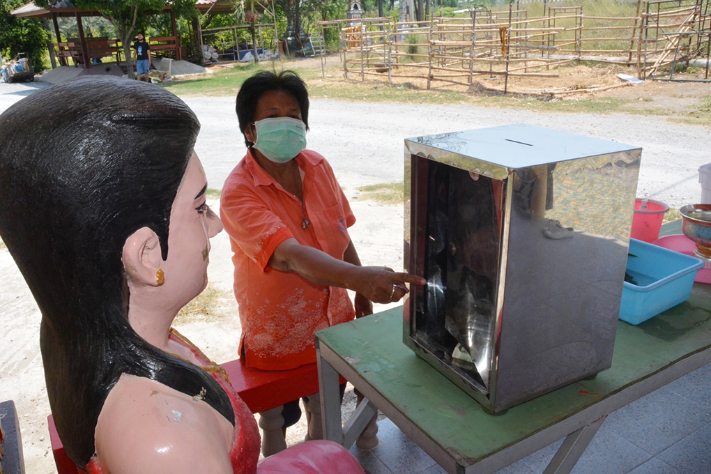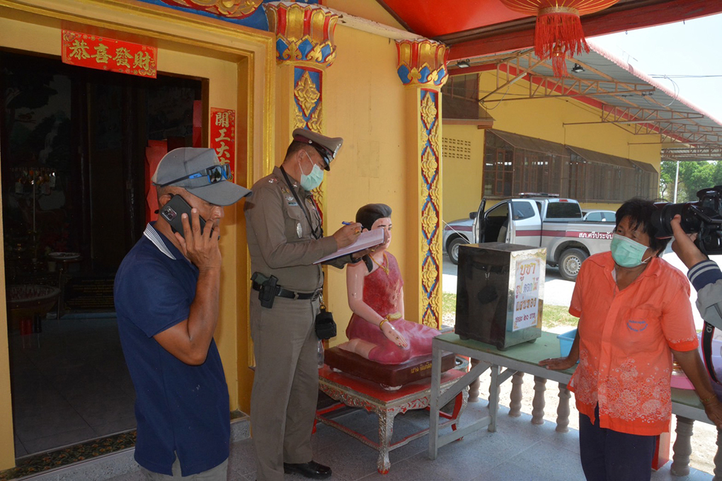 นางสำรวม สารใจ อายุ 58 ปี ผู้ดูแลวิหารหลวงพ่อดำ กล่าวว่า เมื่อวานตนไม่ได้มาทำงานช่วงเช้ามีคนในวัดมาเปิดหน้าวิหาร ยกตู้บริจาคออมาตั้งไว้ตามปกติ หลังจากนั้น ประมาณช่วงหกโมงครึ่ง มีคนที่ดูแลหน้าองค์ท้าวเวสสุวรรณ ได้โทรศัพท์ไปตามตนว่าประตูวิหารไม่ได้ปิด ตนจึงมาดูความเรียบร้อยขณะกำลังจะยกตู้เงินบริจาคเข้าไปเก็บไว้ในวิหารพบว่า ฝาตู้บุบเข้าไป ตนตกใจก้มดูก็พบว่าฝาตู้ถูกงัดออกไป จึงตามคนในโบสถ์มาดู และตนได้แจ้งเจ้าอาวาสวัด ว่าตู้ที่วิหารหลวงพ่อดำโดนงัด ซึ่งตู้บริจาค พึ่งเปิดเก็บเงินไป ก่อนเกิดเหตุประมาณ 2 วัน น่าจะมีเงินบริจาคทำบุญเหลืออยู่ในตู้ที่คนร้านได้ไปน่าจะ ประมาณ 400-500 บาท