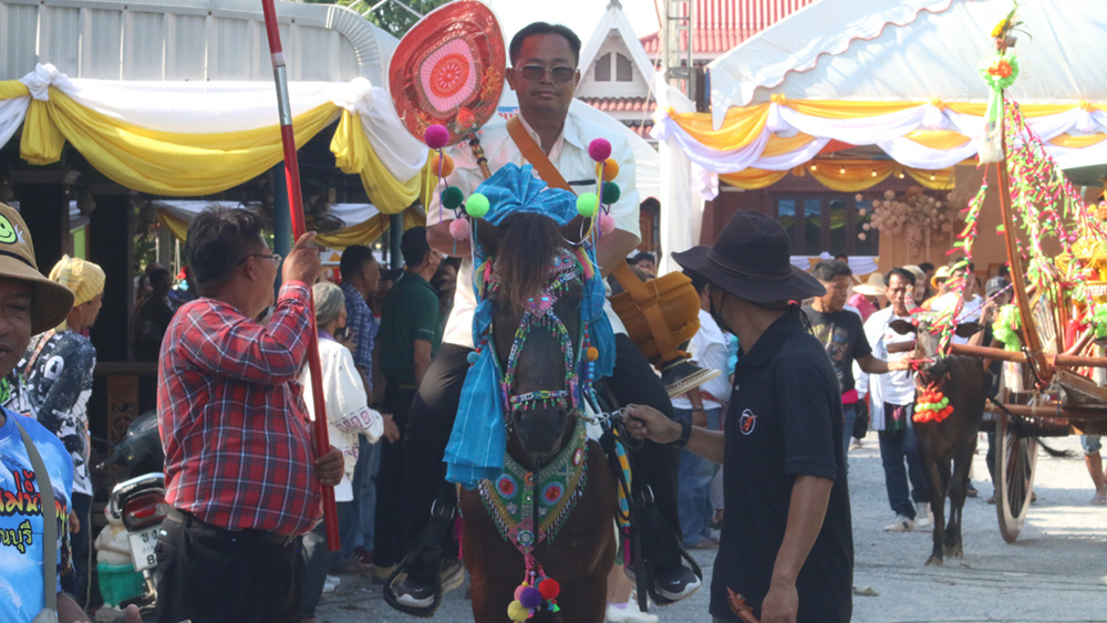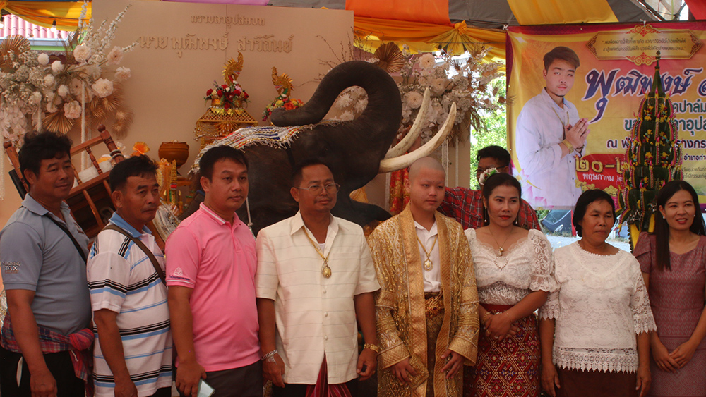 เช้าวันที่สองทางเจ้าภาพได้นำ นายพุฒิพงษ์ สาวิกันย์ (หรือนาคปาล์ม) จากบ้านไปยังวัดรางกระต่าย เพื่อทำการอุปสมบท โดยทางเจ้าภาพได้ใช้รถเครื่องเสียง ใช้ทั้งช้าง ใช้ทั้งม้า ใช้ทั้งวัวเทียมเกรียน ใช้ทั้งกระบือเผือก ไปร่วมแห่นาคไปอุปสมบทยัง วัดรางกระต่ายรังสรรค์ ซึ่งในสภาพอากาศที่ร้อนเกิน 41 องศา ผู้ไปร่วมงานได้ใช้ร่มกางเพื่อกันแดด เมื่อเจ้าภาพได้นำนาค วนพระอุโบสถ ครบ 3 รอบ แล้วทางนาค และเจ้าภาพได้ทำการโปรยทานให้กับประชาชนที่ไปร่วมในงานนับหมื่นคนจนแน่นวัดรางกระต่ายรังสรรค์ โดยเจ้าภาพได้ใช้เงินเหรียณบาท เหรียณ 10 บาท รวมถึงทองคำ และคูปองเขียนลงเงินสดจำนวน 100 – 500 และ 1,000 บาท รวมแล้วกว่า 2 แสนบาท และในช่วงที่ทำการโปรยทานประชาชนได้ใช้ร่มที่กางเปลี่ยนเป็นการรองรับการโปรยทานสร้างสีสันต์ในครั้งนี้คึกคักมากๆ