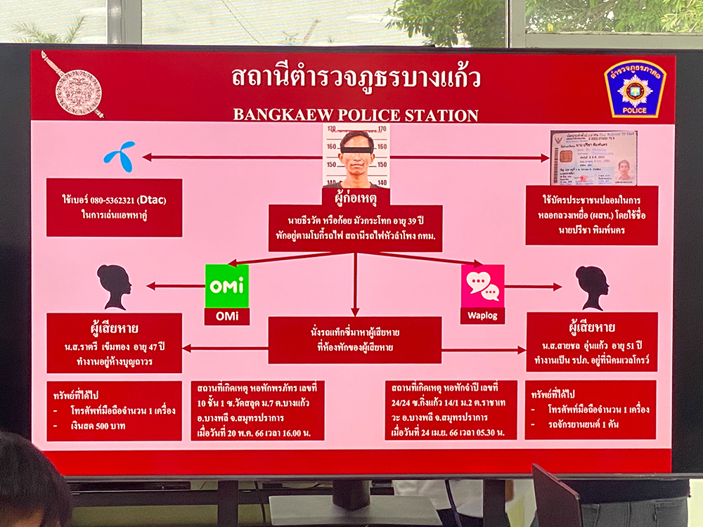 ***** พ.ต.ท.ชาญวุฒิ เทียมมงคล รอง.ผกก.สส.สภ.บางแก้ว เผยว่า พฤติการณ์ของผู้ก่อเหตุนั้น จะใช้แอพพลิเคชั่นหาคู่ ซึ่งผู้ก่อเหตุใช้อยู่ 2 แอพ คือ OM! และ Waplog เข้าไปพูดคุยกับผู้หญิงที่มีอายุ 40 – 50 ปี โดยทำการพูดคุยเชิงชู้สาว ก่อนที่จะมาติดต่อกันทางเบอร์โทรศัพท์ มีการวีดีโอคอล คุยกัน จนทางผู้เสียหายตายใจ จนมีการนัดพบกัน ก่อนที่จะมีหลับนอนกัน ก่อนที่ผู้ก่อเหตุจะอาศัยช่วงผู้เสียหายเผลอลักทรัพย์สินของผู้เสียหายก่อนที่จะหลบหนีไป โดยที่ผู้ก่อเหตุคนดังกล่าวได้ก่อเหตุในพื้นที่ สภ.บางแก้ว มาแล้ว 2 ครั้ง ครั้งแรกเมื่อ วันที่ 24 เมษายน 2566 ผู้ก่อเหตุใช้แอพ Waplog โดยผู้ก่อเหตุได้ โทรศัพท์มือถือ 1 เครื่อง และ รถจักรยานยนต์ 1 คัน ต่อมา วันที่ 20 พฤษภาคม 2566 ผู้ก่อเหตุใช้ OM! โดยผู้ก่อเหตุได้ โทรศัพท์มือถือ 1 เครื่อง และ เงิน 500 บาท เป้าหมายเป็นผู้หญิงที่อายุ 40 – 50 ปี โดยผู้ก่อเหตุไม่ได้ทำงาน จึงใช้แอพหาคู่เข้าไปหาเหยื่อ หลังจากผู้เสียหายเข้ามาแจ้งความร้องทุกข์ ทางชุดสืบสวนได้ทำการติดตามสืบสวนอย่างต่อเนื่อง มาการวางตัวสายลับ เข้าไปพูดคุยกับทางผู้ก่อเหตุ ในแอพพลิเคชั่นหาคู่ จนสามารถจับกุมตัวผู้ก่อเหตุได้ในที่สุด