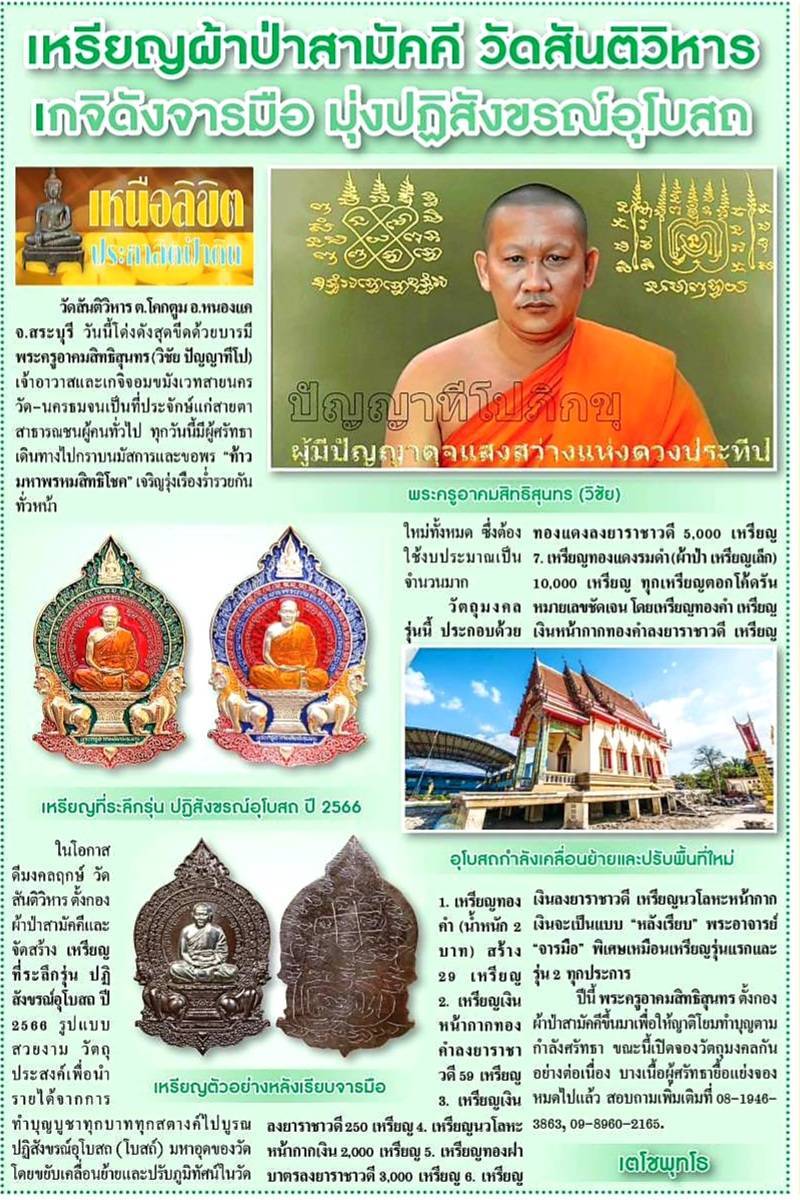 วันนี้ที่ 3 มิถุนายน 2566 นายธนสารสิทธาภาผู้อำนวยการแขวงทางหลวงสระบุรี นายจตุพลสิงห์โต กำนันตำบลโคกตูม จ.สระบุรี นายสมคิด บุญทอง จ.สมุทรปราการ มีความประสงค์บริจาควัสดุก่อสร้าง เหล็กข้ออ้อย 400 เส้นเหล็กเส้นกลม 270 เส้น ลวดดำ 10 ขดหิน 1 รถพ่วง ปูน 400 ลูก ทราย 1 รถพ่วง ร่วมปฏิสังขรณ์อุโบสถวัดสันติวิหารจ.สระบุรี ซึ่งทางพระครูอาคมสิทธิสุนทร (วิชัย) เจ้าอาวาส ที่กำลังก่อสร้างอยู่ให้สำเร็จลุล่วงไปด้วยดี โดยมีไวยาวัจกร และคณะกรรมการรับมอบ เพื่อสานต่อเจตนารมณ์ของท่านพระครูอาคมสิทธิสุนทร (วิชัย) เจ้าอาวาส วัดสันติวิหารในขณะเดียวกันยังมีผู้ที่จะขอบริจาคเงินเพื่อสานต่อจากพระครูอาคมสิทธิสุนทร (วิชัย) ที่ล้มป่วยอยู่ในขณะนี้ประชาชนลูกศิษย์ของพระอาจารย์วิชัยทยอยโอนเงินเข้ามาบางคนก็มาบริจาคที่วัดโดยมี นายชูชาติไวยาวัจกรคอยรับมอบ เพื่อสมทบทุนสร้างต่อให้เสร็จขณะท่านป่วยอยู่คาดว่าคงไม่นาน ท่านคงออกจากโรงพยาบาล มาจำวัดตามปกติแน่นอน
