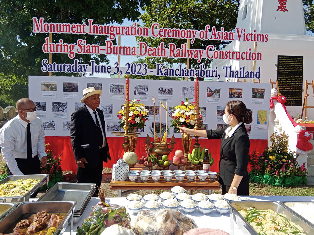 นายอารูมูกัม กันดาซามี อดีตแรงงานชาวทมิฬ (ผู้รอดชีวิตจากสงครามเอเชียบูรพา) นายอนันท์ ดิษฐศิริ ปลัดองค์การบริหารส่วนจังหวัดกาญจนบุรี นางสมมารถ คำถนอม วัฒนธรรมจังหวัดกาญจนบุรี นายสมภพ ธีระสานต์ ประธานกรรมการวัดถาวรวราราม กาญจนบุรี (วัดญวน ) และทายาทอดีตแรงงานที่สูญเสียชีวิตจากการร่วมสร้างทางรถไฟสายมรณะ ส่วนราชการ แขกผู้มีเกียรติร่วมพิธีเปิดฯ และร่วมวางพวงมาลารำลึกถึงบรรพชน