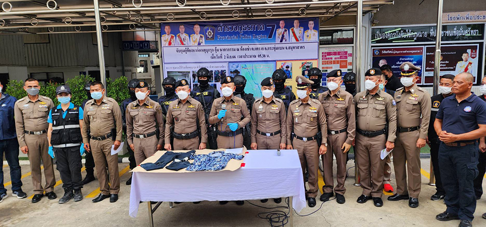 เมื่อเวลา16.30น.ของวันที่ 5 มิถุนายน 2566 ที่สภ.กระทุ่มแบน พล.ต.ท.ธนายุตม์ วุฒิจรัสธำรงค์ ผบช.ภ.7 พล.ต.ต.ชมชวิณ ปุระธนานนท์ รองผบช.ภ.7 พล.ต.ต.ดร.จักษ์ จิตรธรรม ผบก.ภ.จว.สมุทรสาคร พ.ต.อ.เสรีฐกาญจน์ จันทร์ด้วง ผกก.สภ.กระทุ่มแบน พ.ต.อ.ยอดชาย แก้วเรือง ผกก.สส.ภ.จว.สมุทรสาคร พร้อมเจ้าหน้าที่ชุดสืบสวนภ.จว.สมุทรสาคร และเจ้าหน้าที่ชุดสืบสวนสภ.กระทุ่มแบน ร่วมแถลงข่าวการจับกุมนายซายาอ่อง อายุ 30 ปี นายหม่องเมนเทค อายุ 24 ปี นายโซมินตู อายุ 33 ปีนายชิดอ่อง อายุ 25 ปี และนาย นาย เล่น อายุ 24 ปี ซึ่งทั้งหมดสัญชาติเมียนมา พร้อมของกลางรถยนต์เก๋งยี่ห้อโตโยต้าสีทอง หมายเลขทะเบียน กค.-7549 สมุทรสาคร ,รถยนต์กระบะยี่ห้อฟอร์ดสีเทา หมายเลขทะเบียน บษ 5940 กาญจนบุรี พร้อมมีดปลายแหลมยาวประมาณ30เซนติเมตร 1 อันโดยแจ้งข้อกล่าวหาว่าปล้นทรัพย์โดยมีอาวุธปืนเป็นเหตุให้ผู้อื่นถึงแก่ความตาย โดยใช้ยานพาหนะเพื่อสะดวกแก่การกระทำผิดหรือการพาทรัพย์นั้นไป หรือเพื่อให้พ้นการจับกุม ร่วมกันหน่วงเหนี่ยวกักขังผู้อื่นเป็นเหตุให้ผู้ถูกหน่วงเหนี่ยวถึงแก่ความตาย ร่วมกันลักทรัพย์ในเคหสถานในเวลากลางคืน โดยมีอาวุธ โดยใช้ยานพาหนะเพื่อสะดวกแก่การกระทำผิดหรือการพาทรัพย์นั้นไป หรือเพื่อให้พ้นการจับกุม และร่วมกันบุกรุกเคหสถานในเวลากลางคืนโดยใช้กำลังประทุษร้ายหรือขู่เข็ญว่าจะใช้กำลังประทุษร้าย โดยมีอาวุธหรือโดยร่วมกระทำความผิดด้วยกัน ตั้งแต่สองคนขึ้นไป