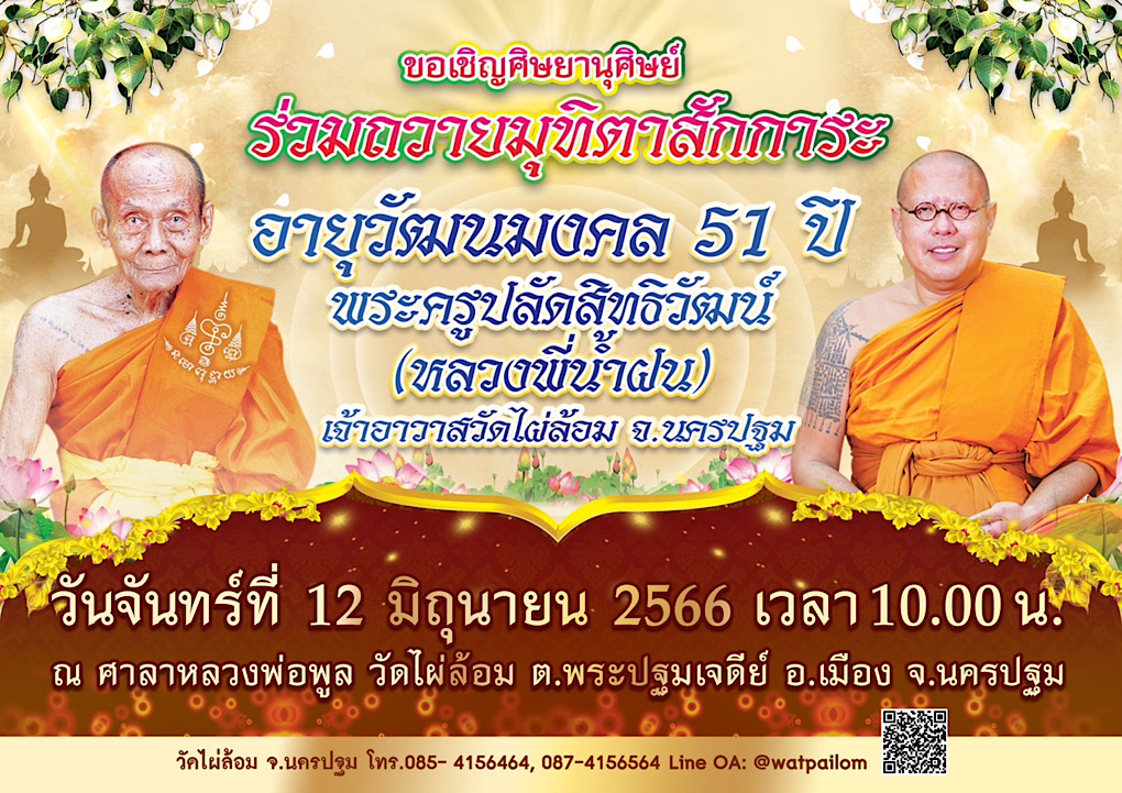 ขอเชิญศิษยานุศิษย์ร่วมถวายมุทิตาสักการะ อายุวัฒนมงคล 51ปี พระครูปลัดสิทธิวัฒน์(หลวงพี่น้ำฝน)เจ้าอาวาสวัดไผ่ล้อม จ.นครปฐม