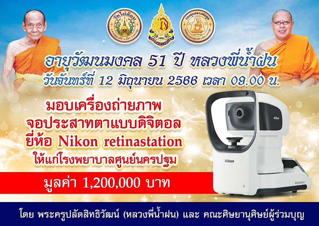มอบเครื่องถ่ายภาพจอประสาทตาแบบดิจิตอลยี่ห้อ Nikon retinastation ราคา1,200,000บาทให้แก่โรงพยาบาลศูนย์นครปฐมโดยคณะศิษยานุศิษย์หลวงพี่น้ำฝน ร่วมบุญ นำโดยนายสมชาติ (นายเงี๊ยบ)สาลีพัฒนา ร้านก๋วยเตี๋ยวลูกชิ้นปลานายเงี๊ยบ